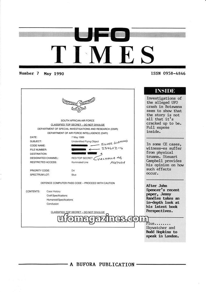 This issue of UFO Times focuses on the alleged UFO crash in Botswana in May 1989, presenting it as a probable hoax. The article details the official South African Air Force report
