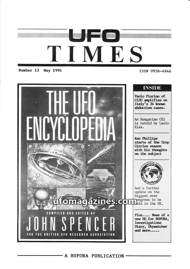 This issue of UFO Times, dated May 1991, highlights 'The UFO Encyclopedia' by John Spencer. It delves into Italian abduction cases, including a historical look back to 1933 and det