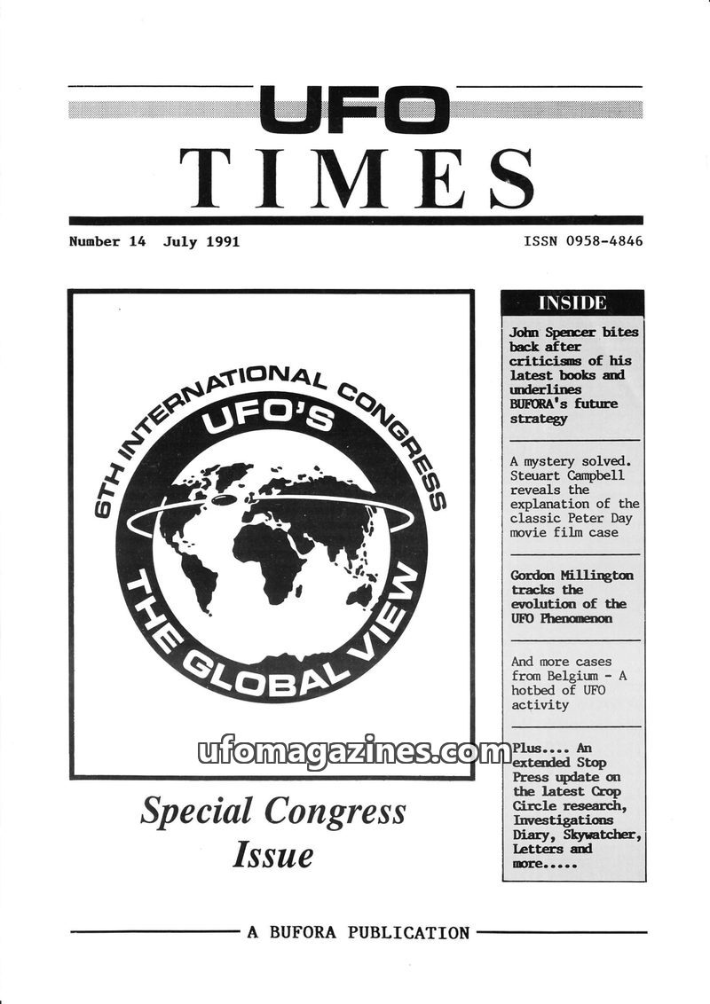 This issue of UFO Times focuses on a Special Congress. It includes an interview with John Spencer discussing his controversial books and vision for British ufology. The magazine al