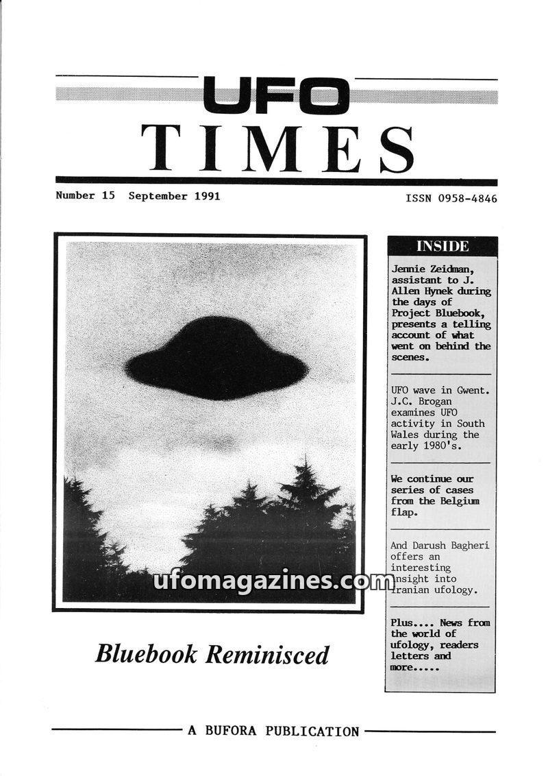 This issue of UFO Times (September 1991) delves into the history of Project Bluebook with Jennie Zeidman's account. It also covers UFO activity in Gwent, Wales, and continues a ser