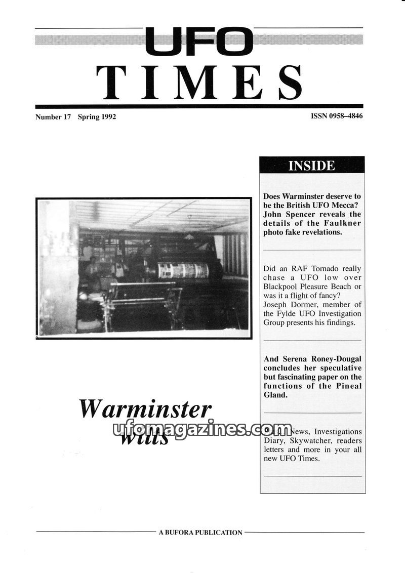 This issue of UFO Times delves into the controversial 'Warminster Hoax,' questioning the authenticity of the famous 'Faulkner photograph' with evidence suggesting it was a staged p