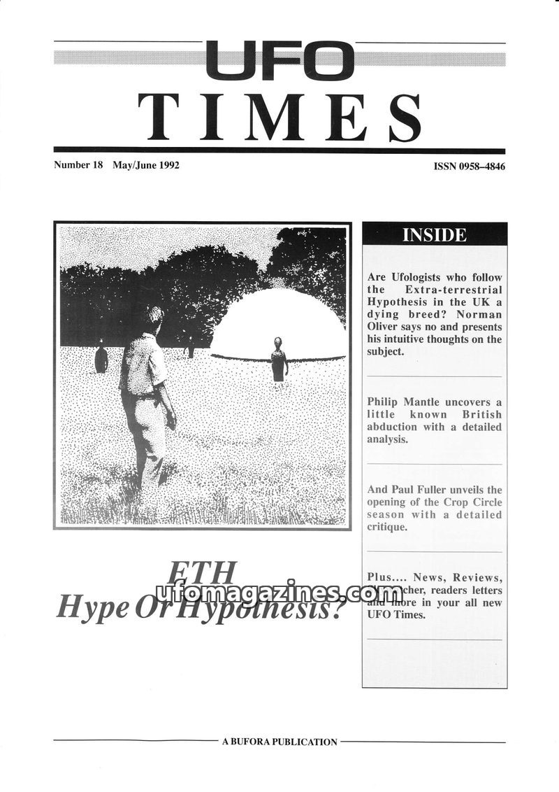 This issue of UFO Times (May/June 1992) delves into the Extra-terrestrial Hypothesis (ETH), questioning whether it's hype or a valid scientific concept. Articles discuss the curren