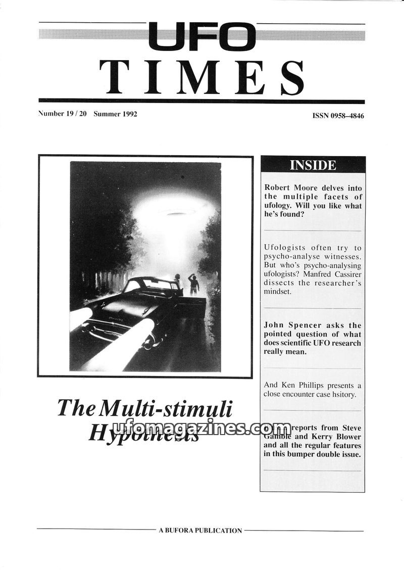 This bumper double issue of UFO Times (Summer 1992) explores various facets of ufology. Robert Moore's 'The Multi-stimuli Hypothesis' proposes that UFO reports can be explained by