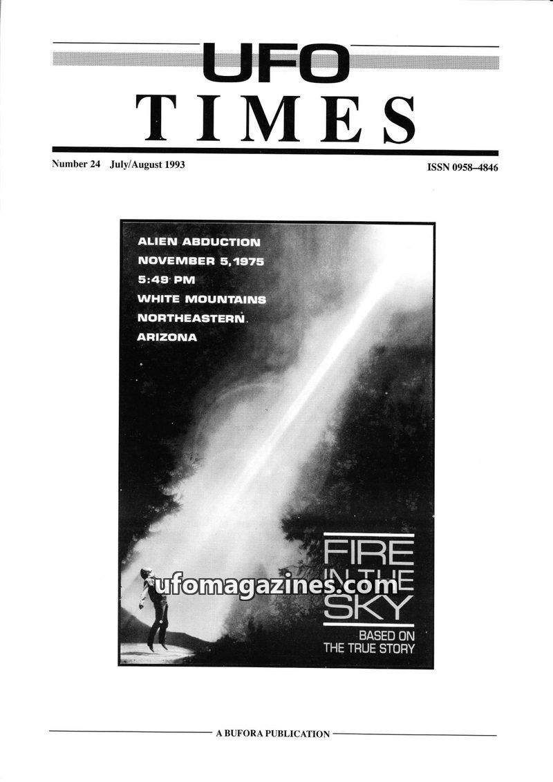 This issue of UFO Times focuses on two major cases. The first is a review of the film 'Fire in the Sky', based on the 1975 Travis Walton abduction case in Arizona, detailing the ev