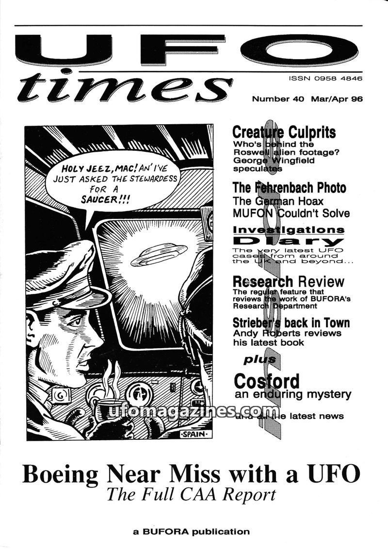 This issue of UFO Times delves into several significant UFO-related events and controversies. It features the full CAA report on a Boeing 737 near miss with an unidentified object,