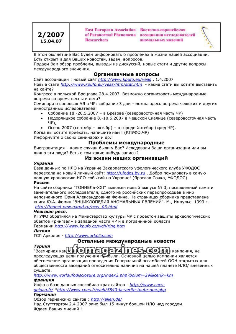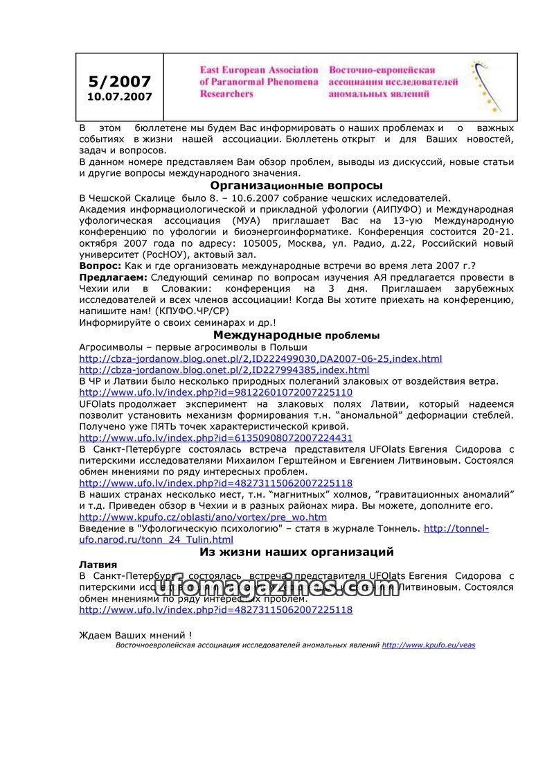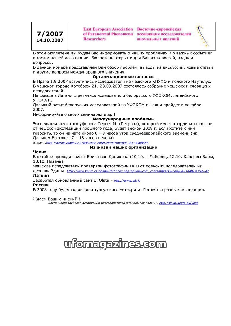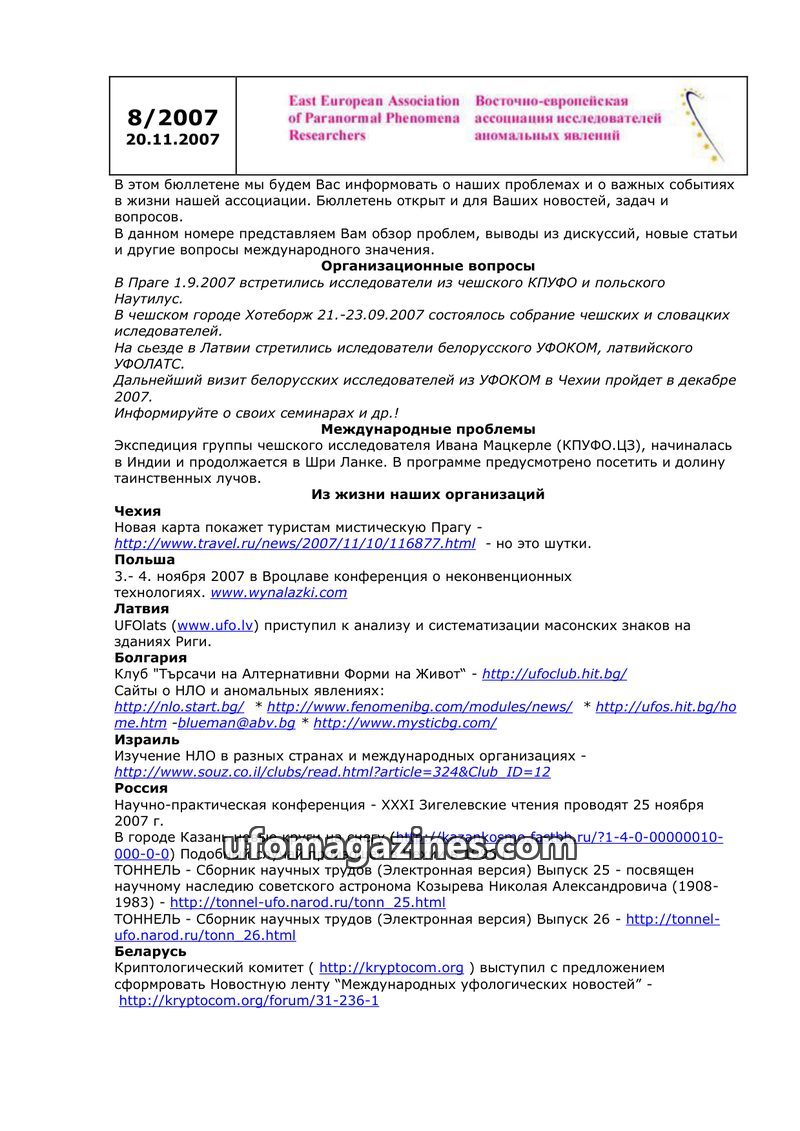 This issue of the newsletter from the East European Association of Paranormal Phenomena Researchers (dated 14.10.2007) provides an overview of organizational matters and important