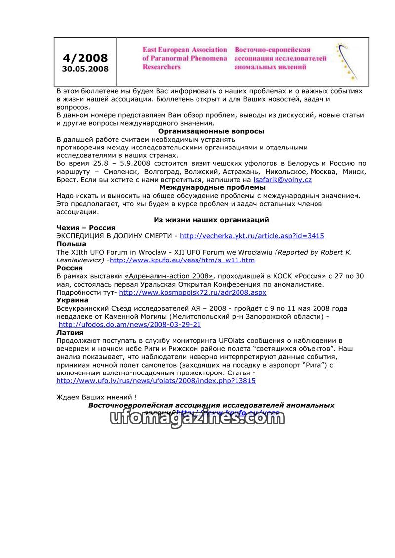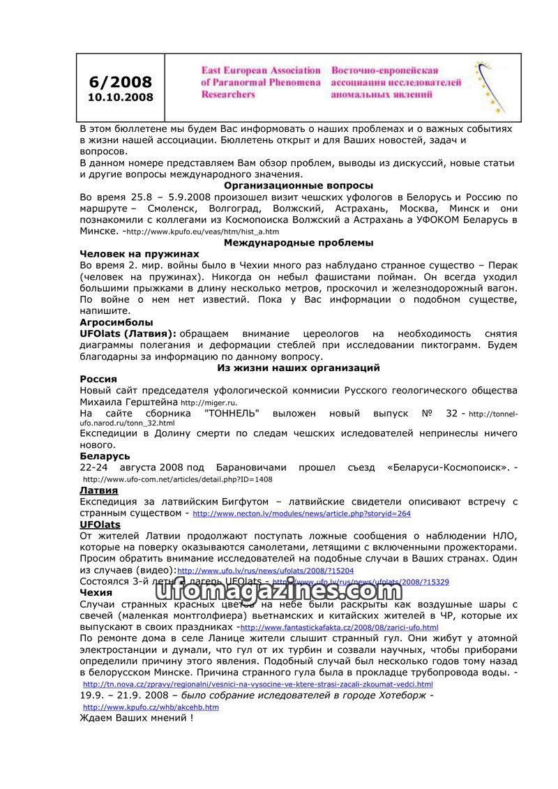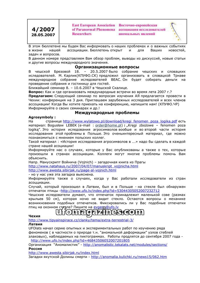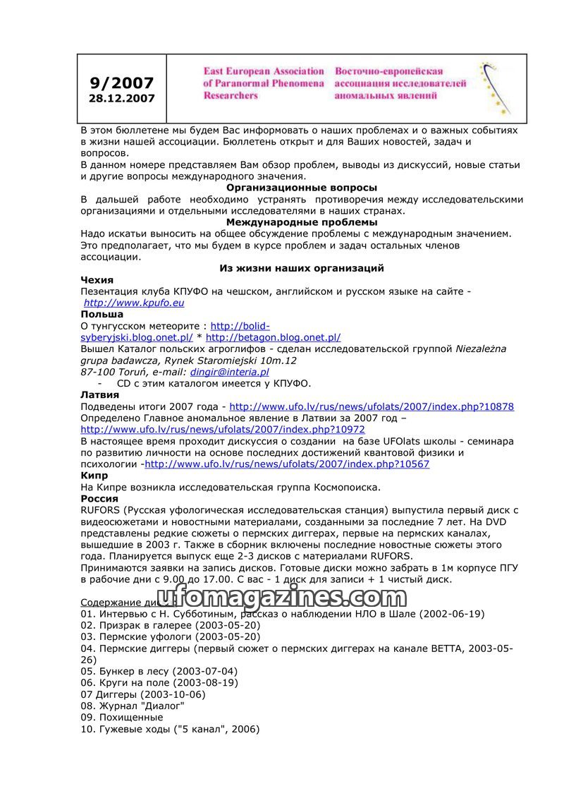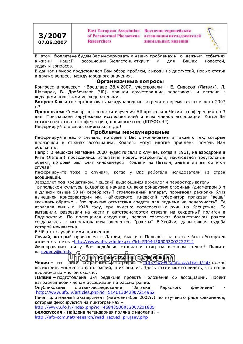 This issue of the newsletter from the East European Association of Paranormal Phenomena Researchers (dated 14.10.2007) provides an overview of organizational matters and important