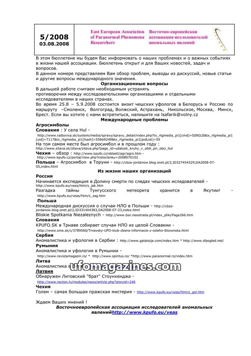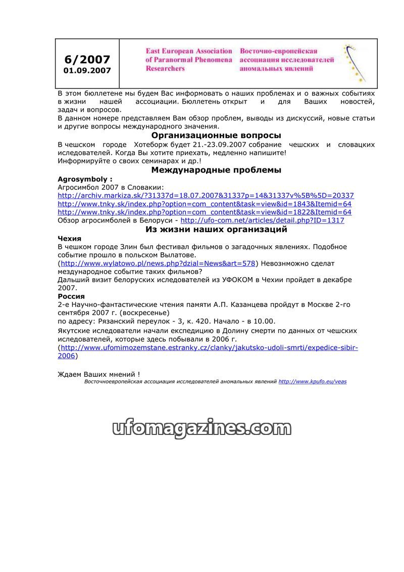 This bulletin from the East European Association of Paranormal Phenomena Researchers (dated September 1, 2007) informs about the association's activities and important events. It a