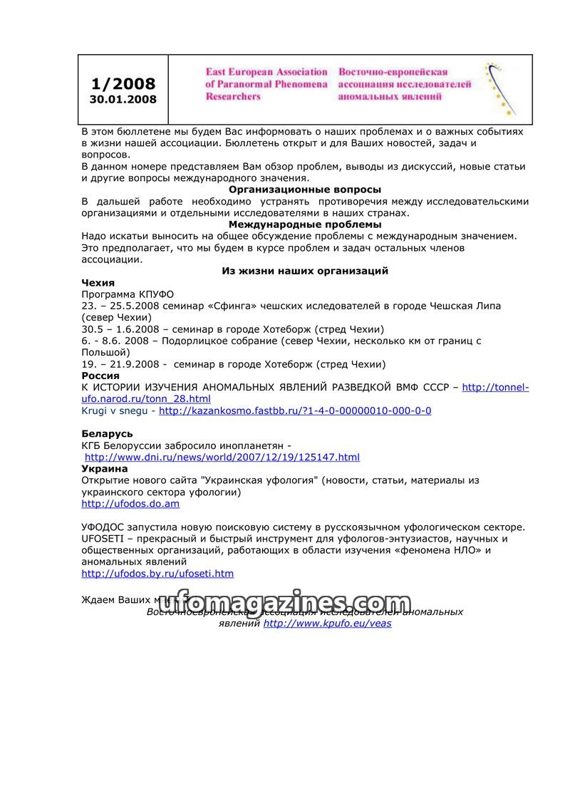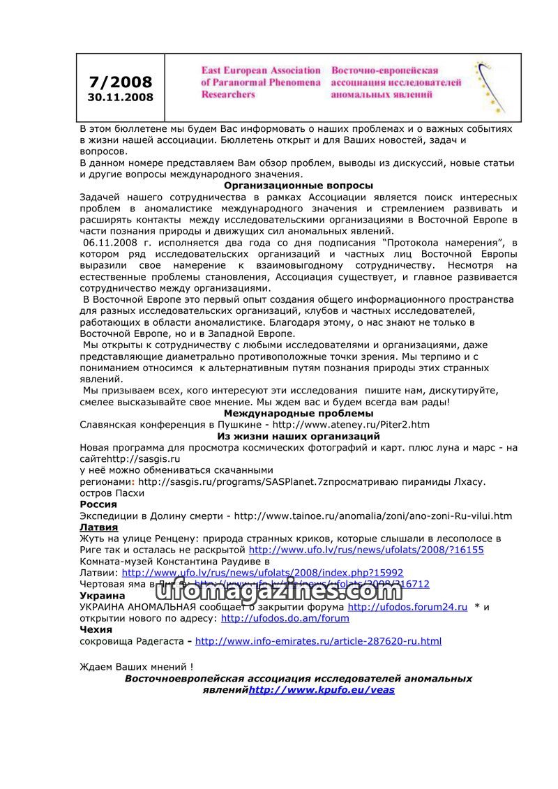This bulletin from the East European Association of Paranormal Phenomena Researchers (dated 20.11.2007) provides an overview of the association's activities and important events. I