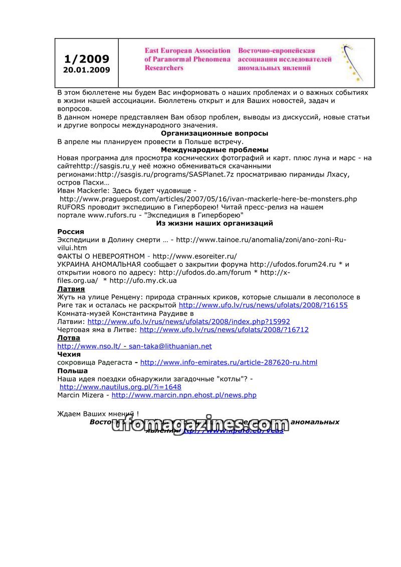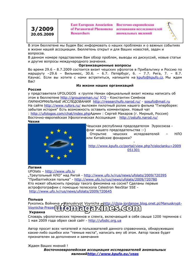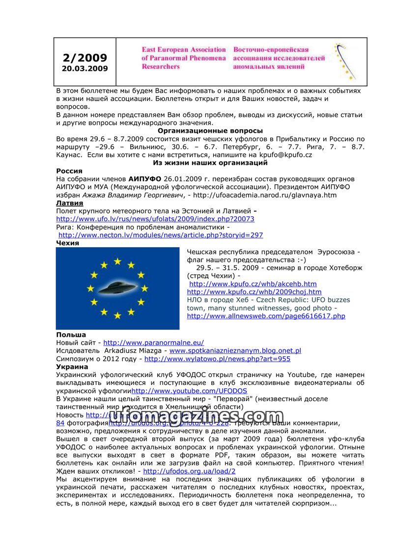 This bulletin from March 20, 2009, by the East European Association of Paranormal Phenomena Researchers, covers organizational matters and news from various national ufology organi