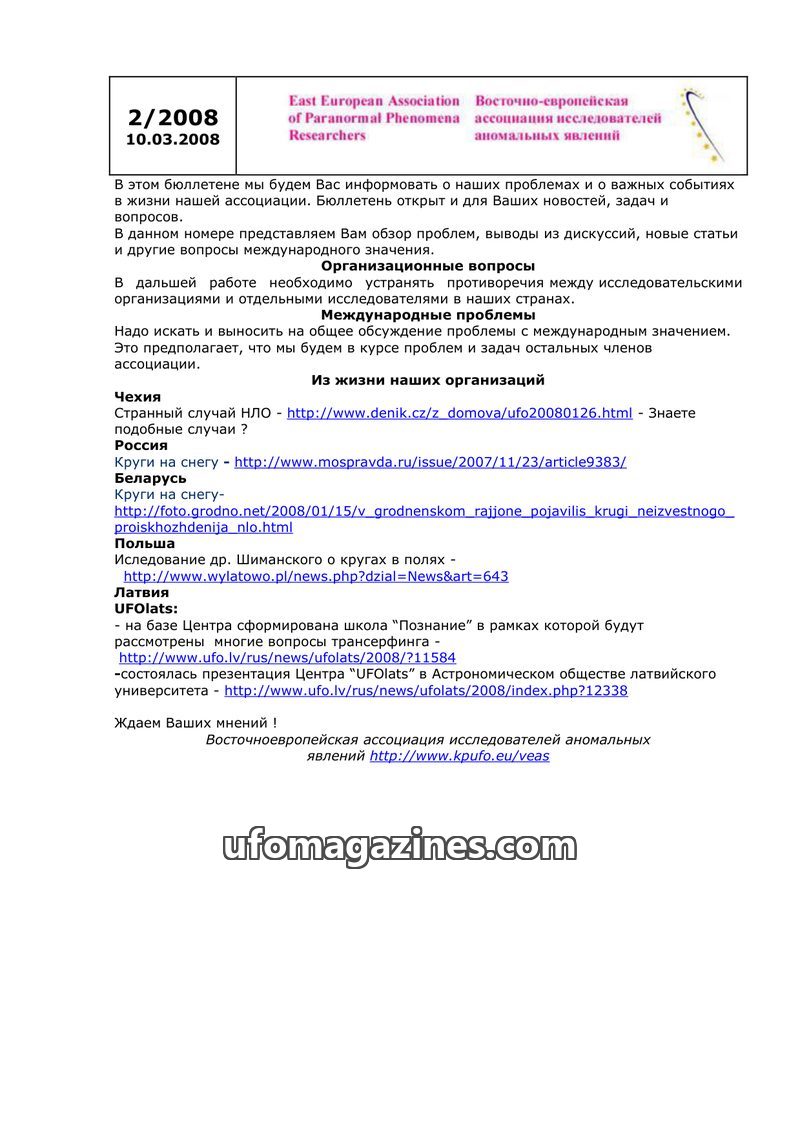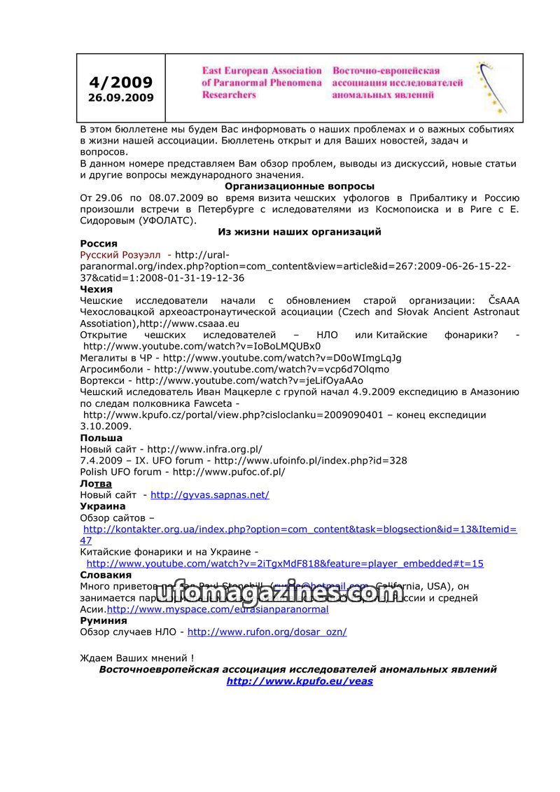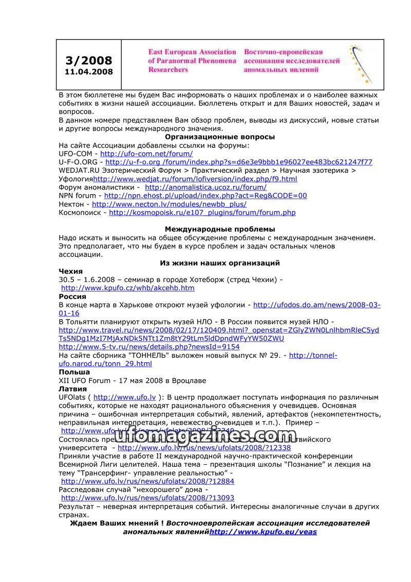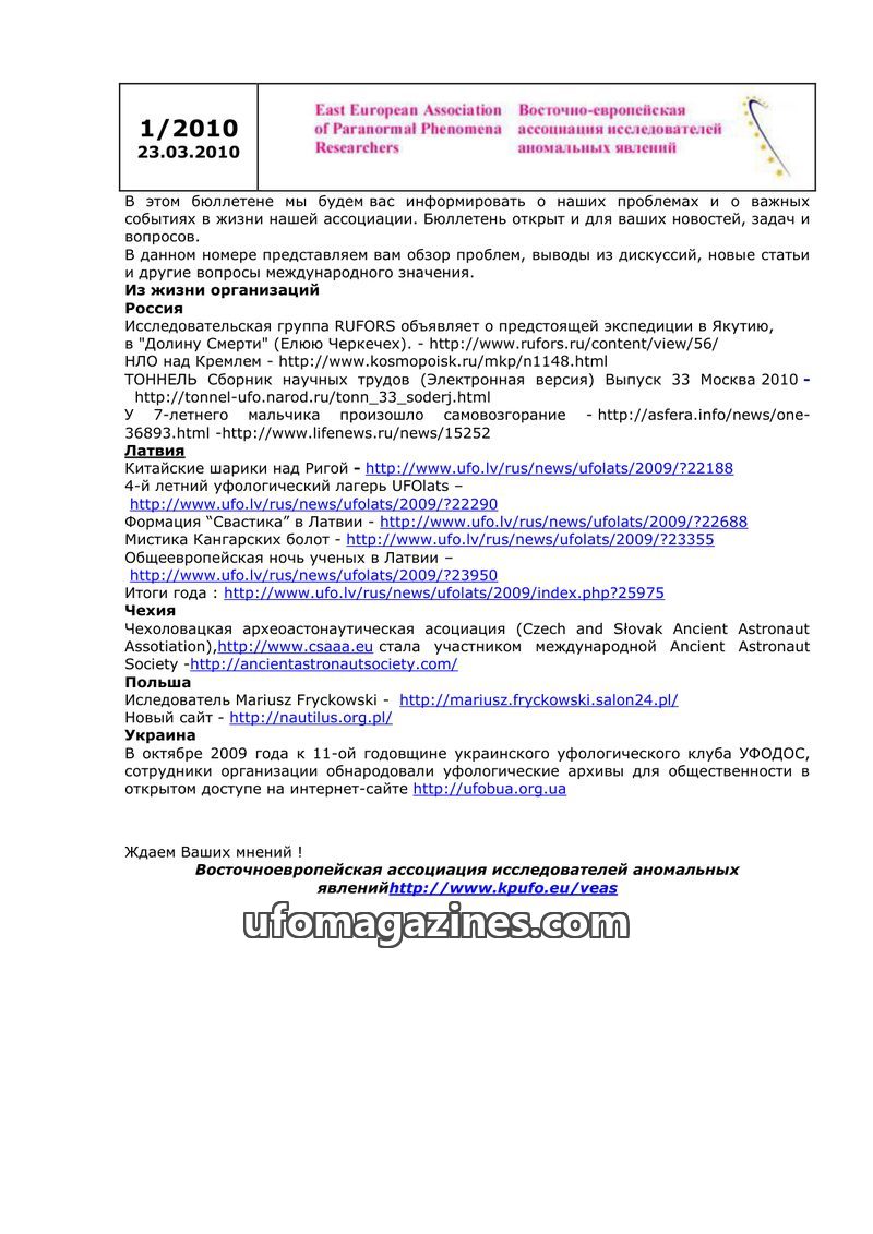 This bulletin from March 20, 2009, by the East European Association of Paranormal Phenomena Researchers, covers organizational matters and news from various national ufology organi