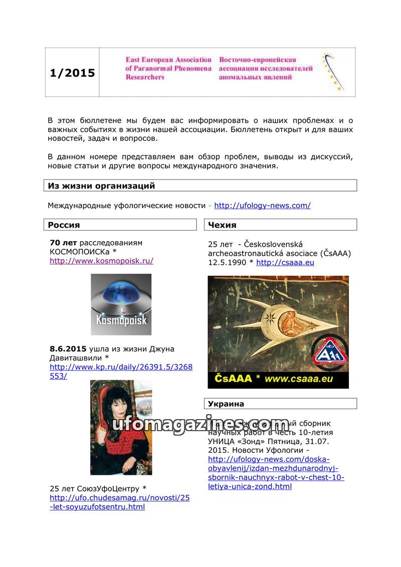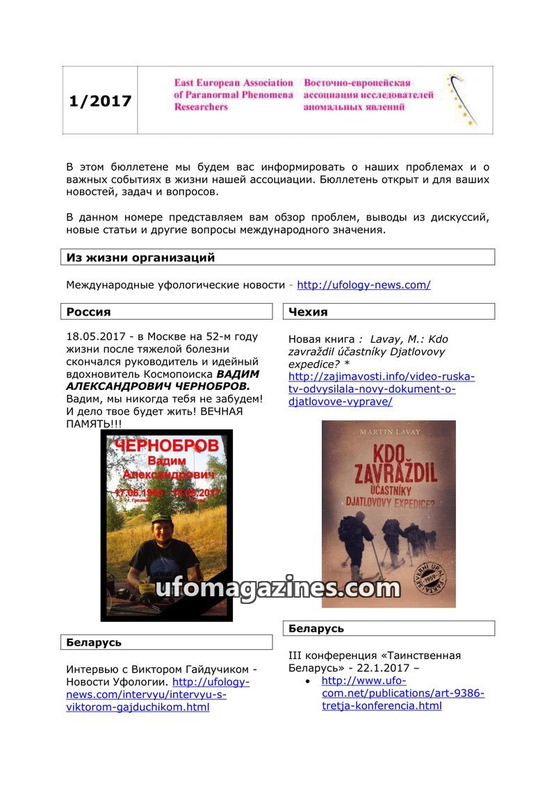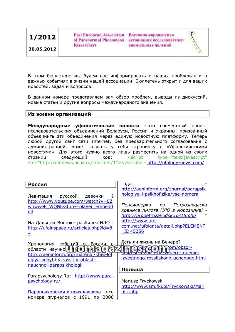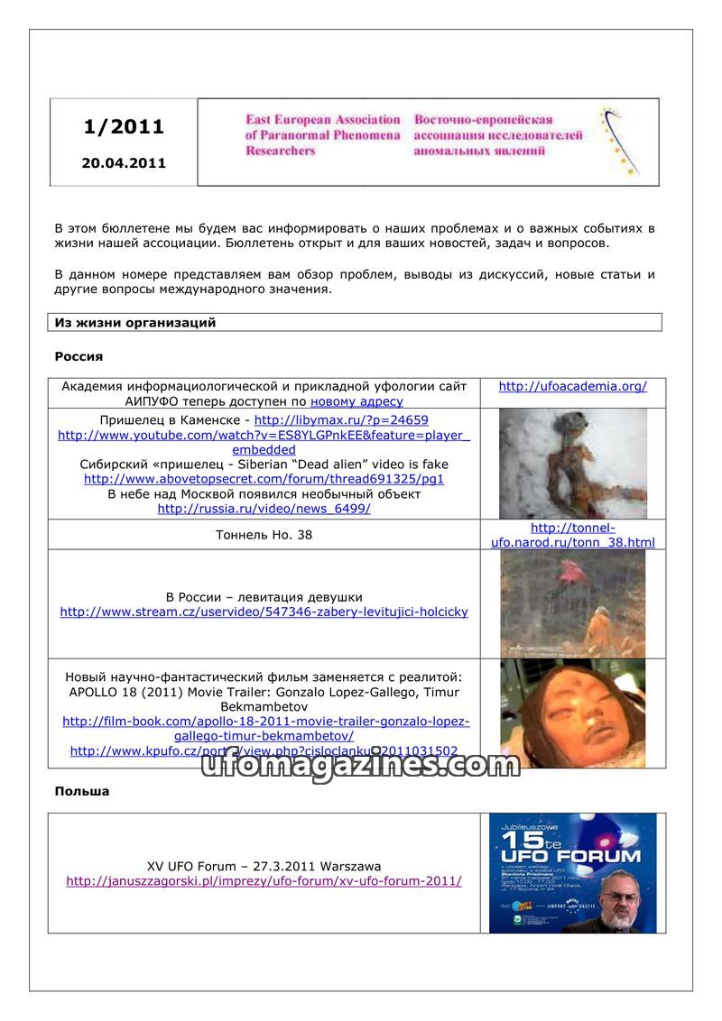 This bulletin from the East European Association of Paranormal Phenomena Researchers provides updates on organizational activities and significant events in ufology across various