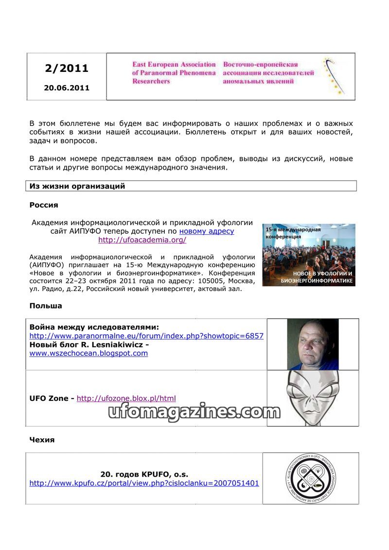 This bulletin from the East European Association of Paranormal Phenomena Researchers (issue 2/2011, June 20, 2011) aims to inform readers about the association's issues and events.