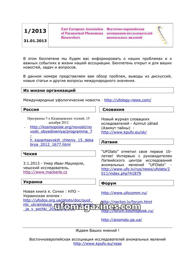 This issue of the newsletter from the East European Association of Paranormal Phenomena Researchers, dated January 31, 2013, aims to inform readers about the association's activiti