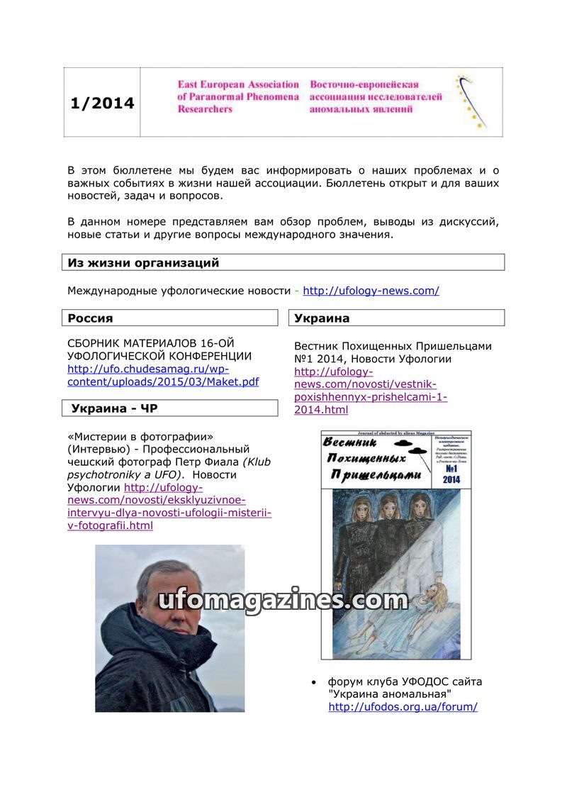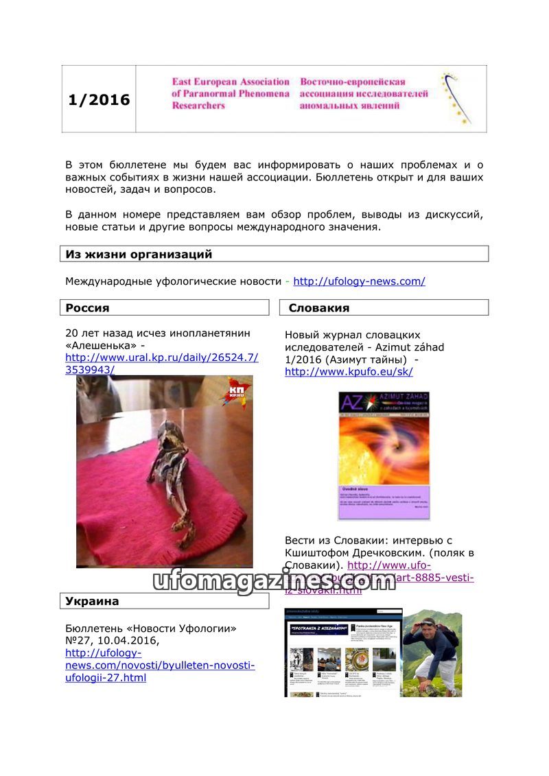 This issue of the East European Association of Paranormal Phenomena Researchers bulletin (1/2016) provides an overview of international ufology news and events. It highlights the 2