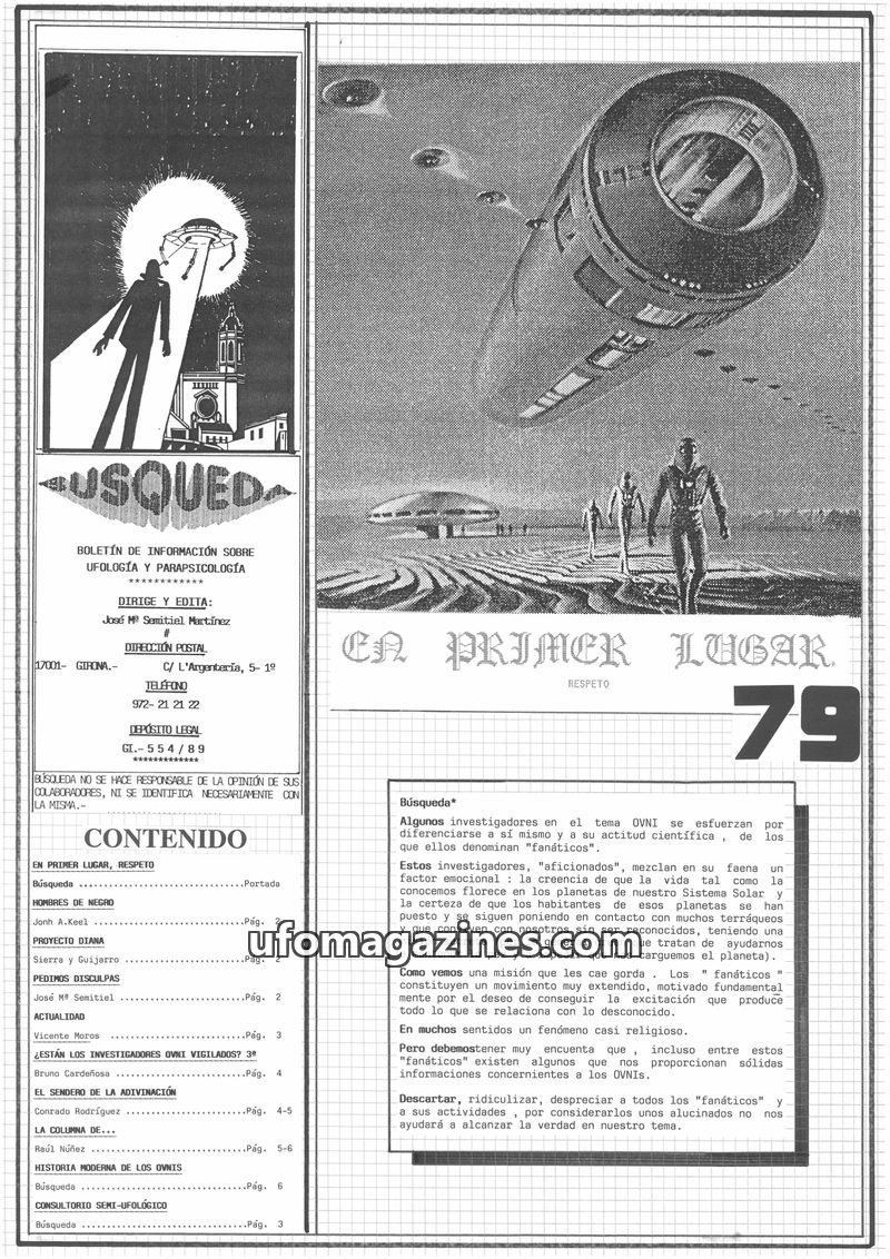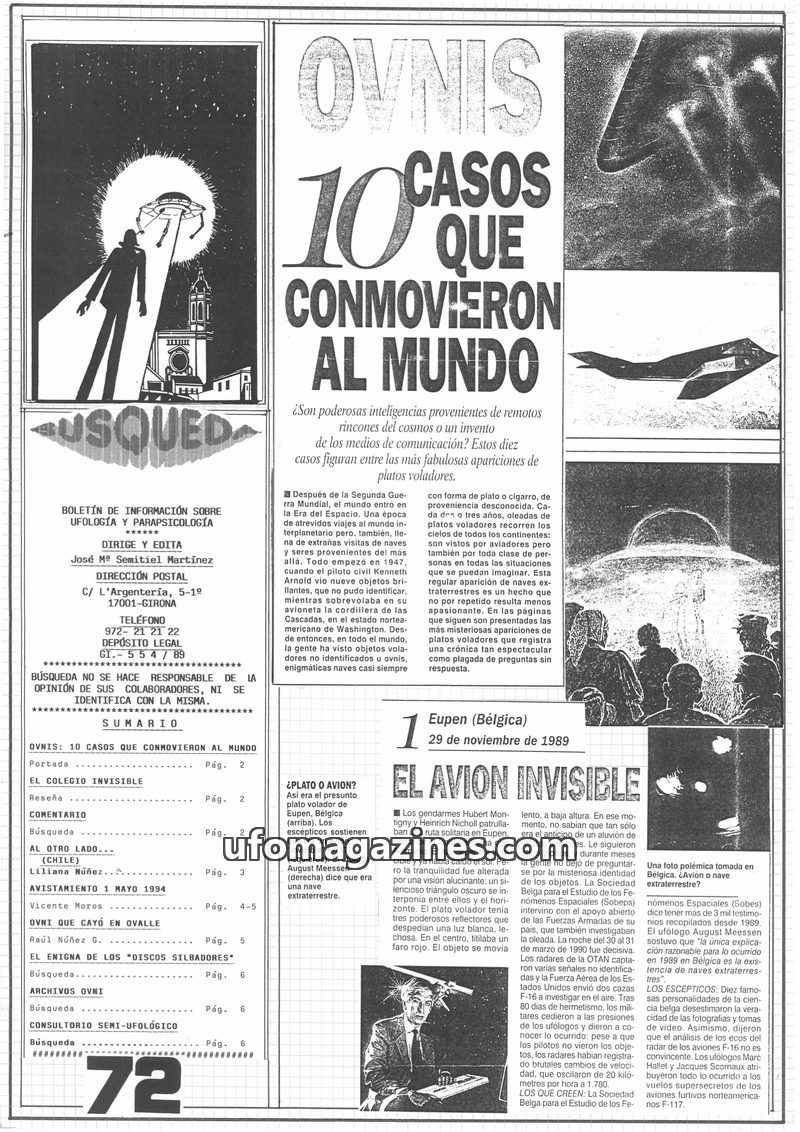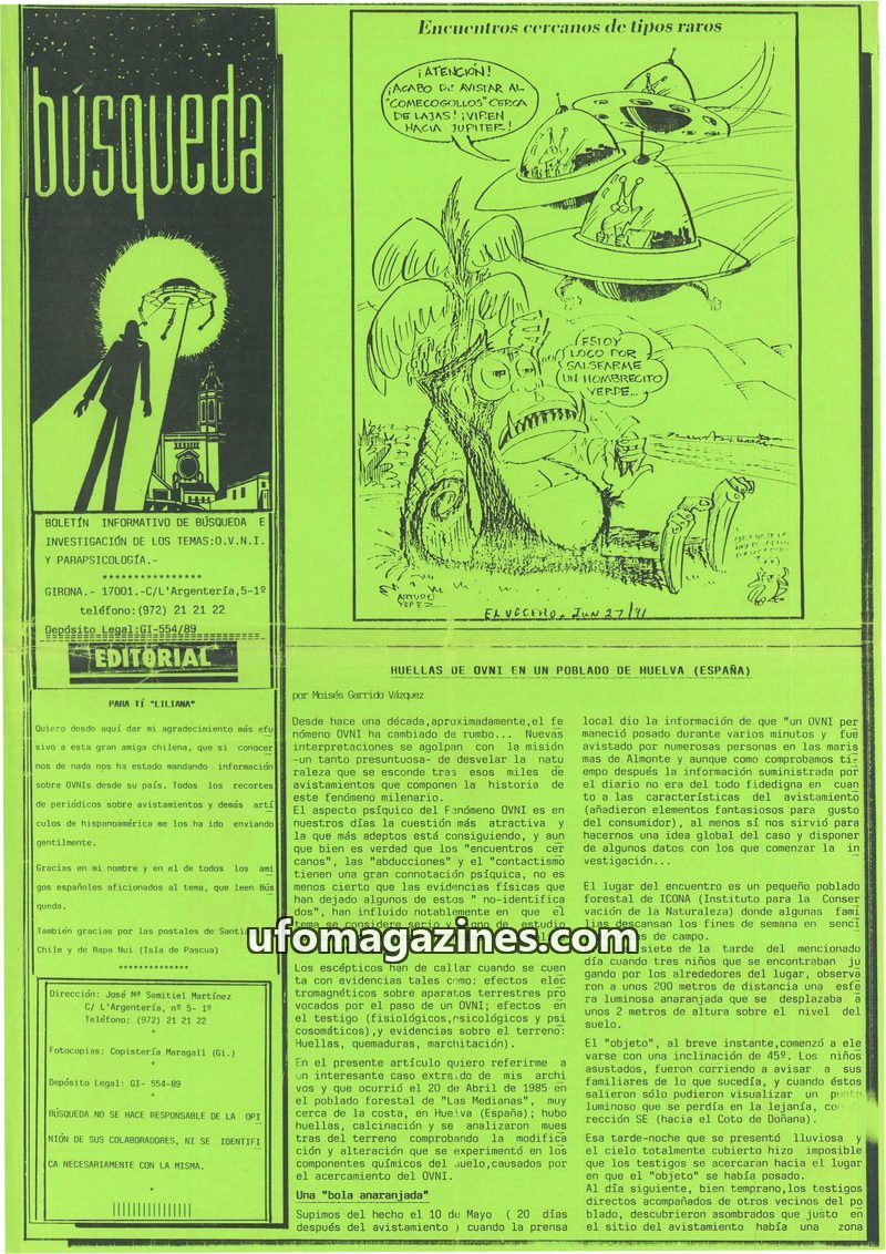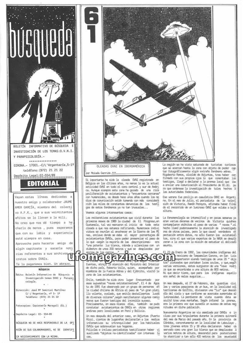 This issue of 'Busqueda' magazine focuses on UFO phenomena, detailing a sighting by nine people in Boadella, Spain, and similar accounts from Cassà de la Selva. It also includes re