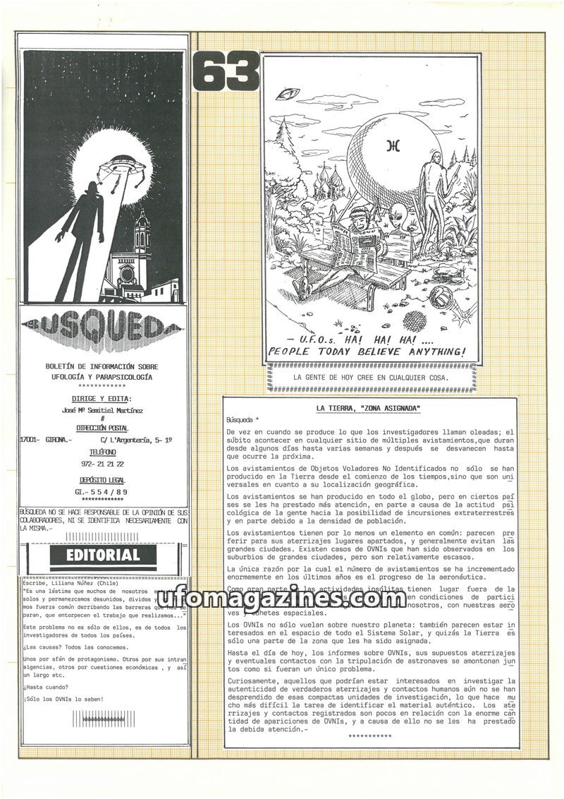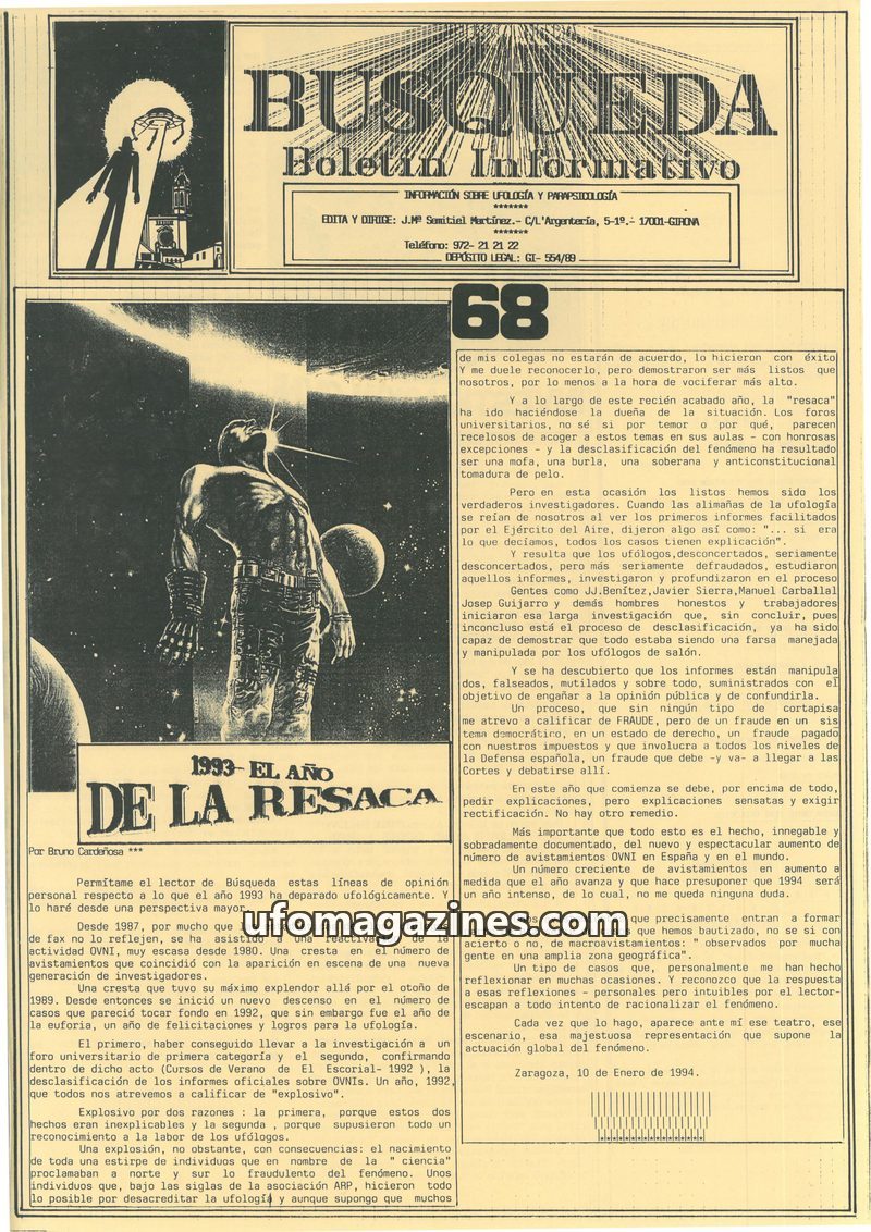 This issue of Busqueda magazine reflects on the year 1993 as a 'hangover' following a surge in UFO activity and a perceived 'explosive' year for ufology in 1992 due to university r