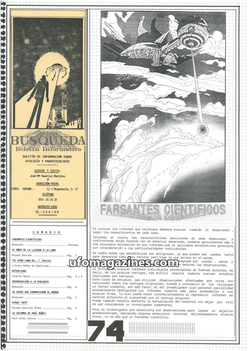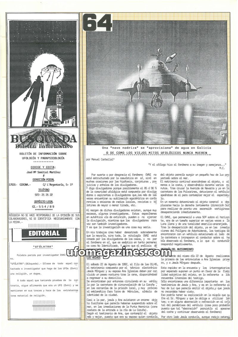 This issue of BÚSQUEDA delves into UFO phenomena, featuring a detailed account of a sighting in La Coruña, Spain, where a couple witnessed a 'mothership' apparently collecting wate