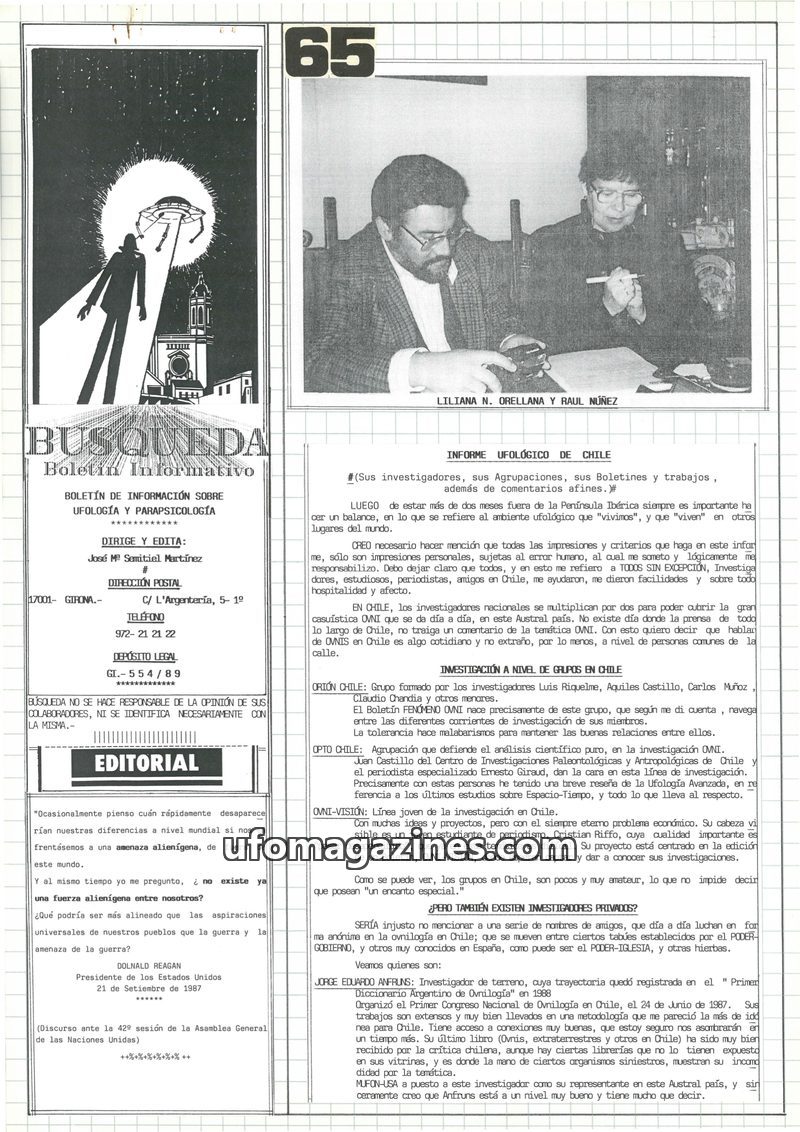 This issue of Busqueda magazine delves into various UFO and parapsychology topics. It discusses the USAF's explanation for the Roswell incident, personal accounts of UFO sightings