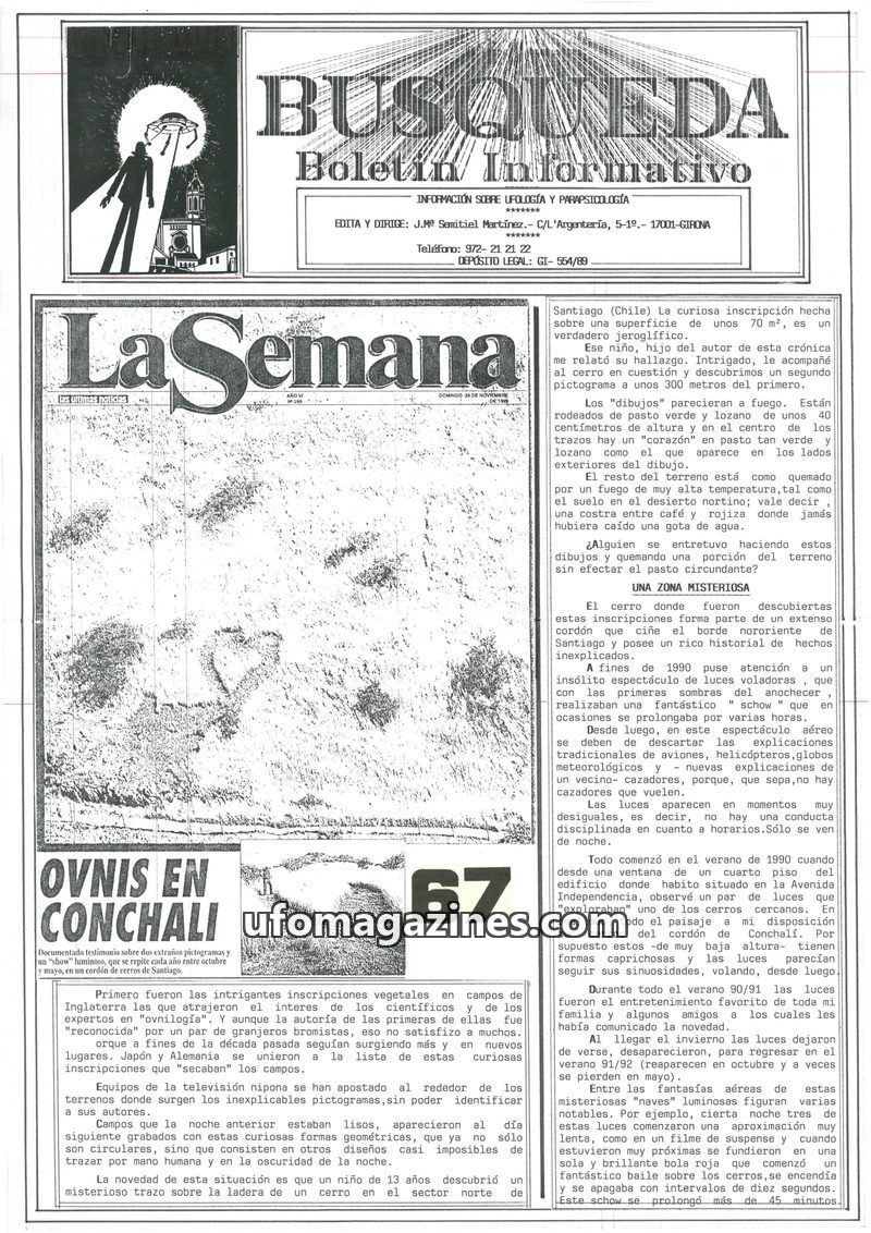 This issue of 'Búsqueda' delves into the phenomenon of UFOs and mysterious crop circles observed in Conchalí, Chile, featuring eyewitness accounts of luminous objects and enigmatic
