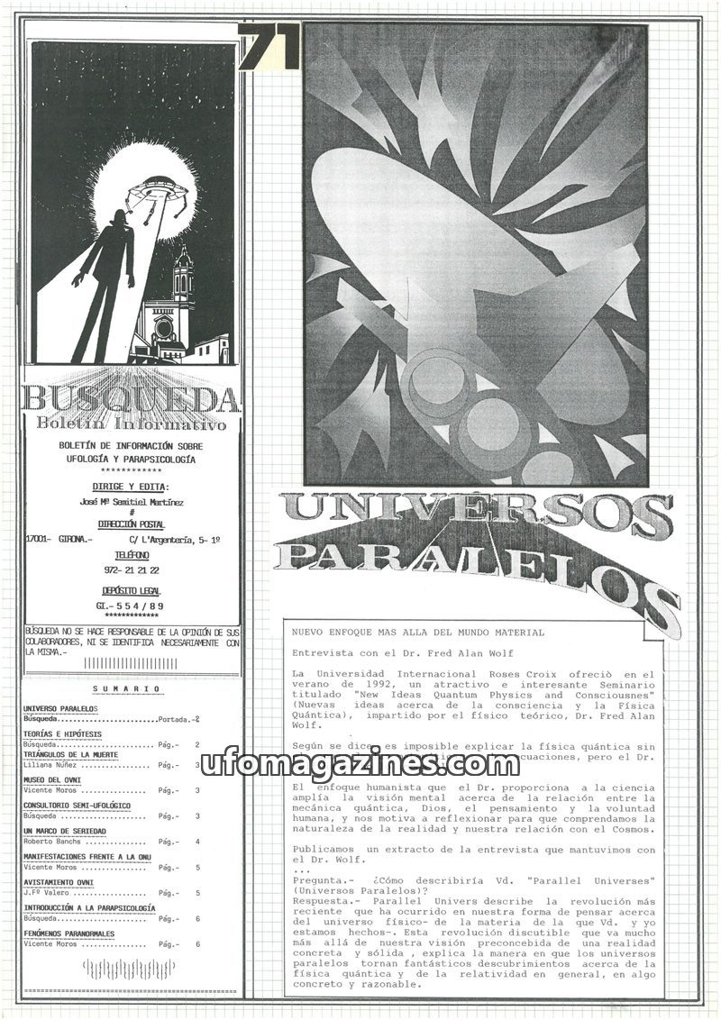 This issue of 'BUSQUEDA' delves into the concept of parallel universes through an interview with physicist Dr. Fred Alan Wolf, exploring the intersection of quantum physics, consci