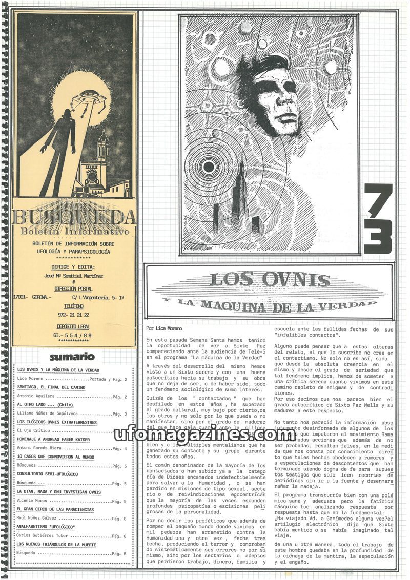This issue of Busqueda magazine critically examines the phenomenon of UFOs and 'contactees,' particularly focusing on Sixto Paz Wells' appearance on the TV show 'La Máquina de la V