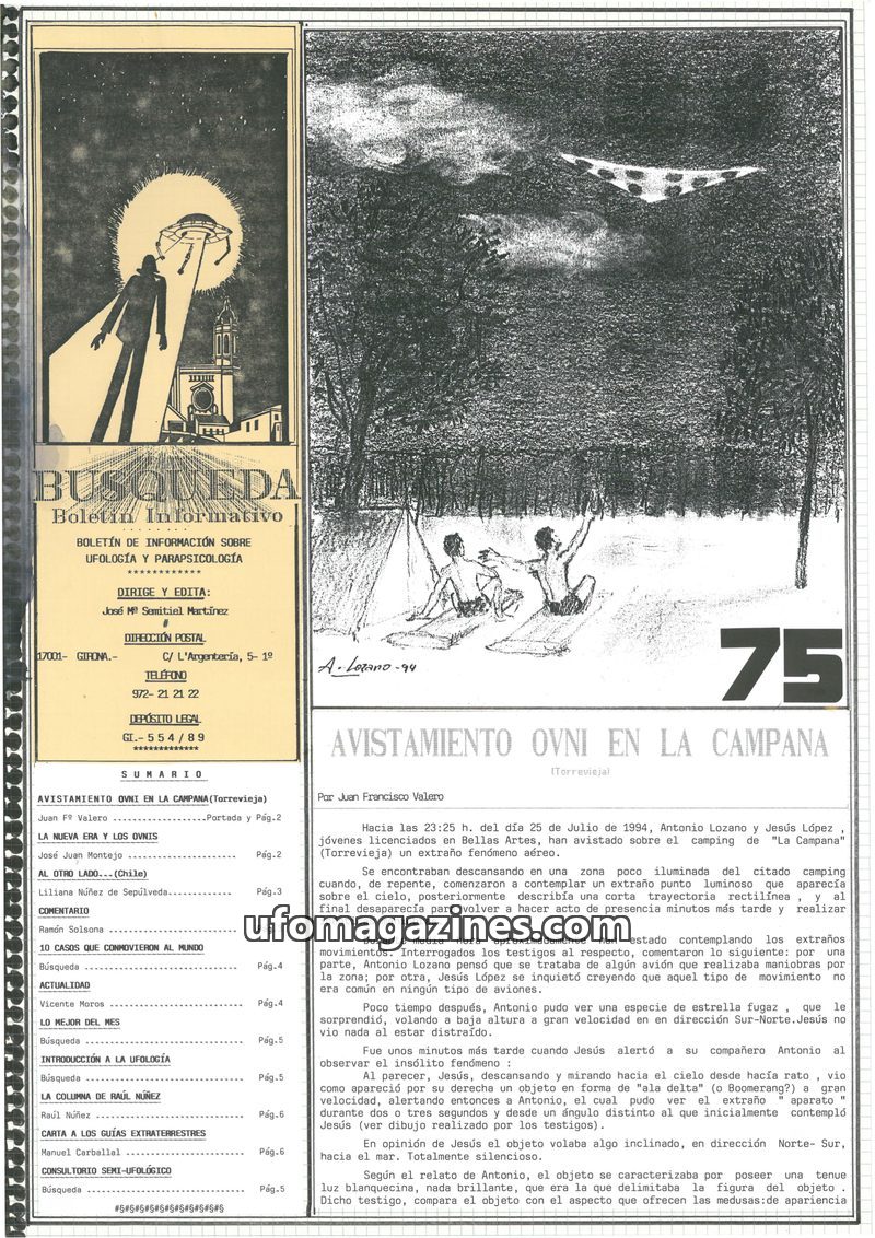 This issue of Busqueda magazine focuses on UFO phenomena, featuring a detailed account of an encounter in Torrevieja, Spain, by Antonio Lozano and Jesús López. It also revisits the