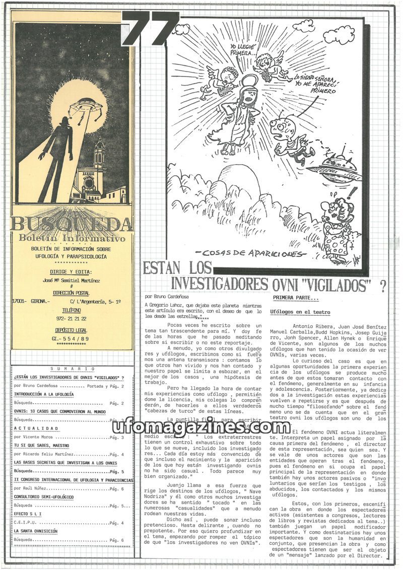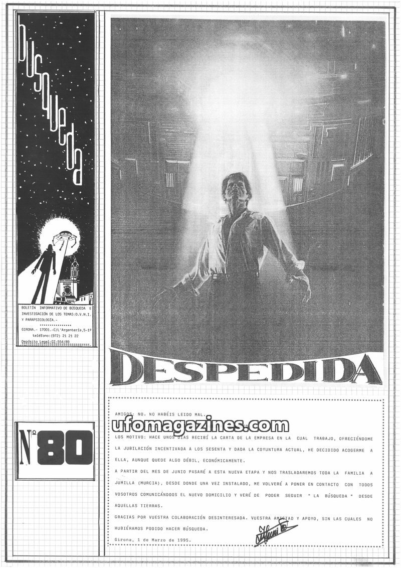 This final issue of Búsqueda magazine announces its cessation due to the publisher's retirement. It includes articles discussing the alleged surveillance of UFO investigators, the