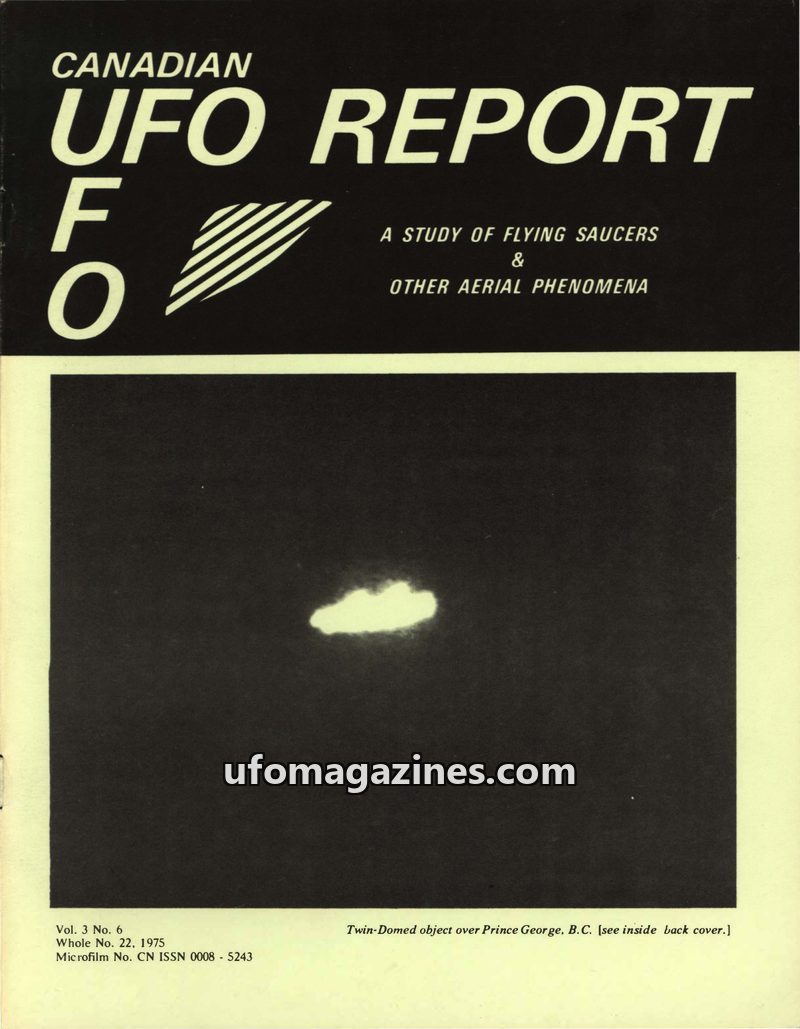 This issue of Canadian UFO Report from 1975 details numerous UFO sightings across Canada, including a twin-domed object over Prince George, B.C., and a bright light in the Yukon. I