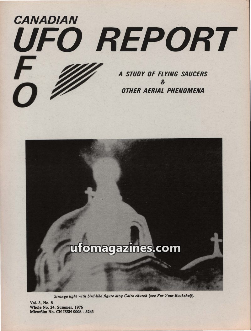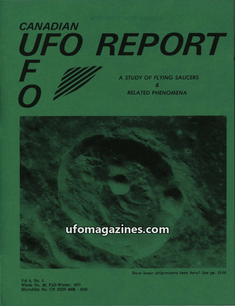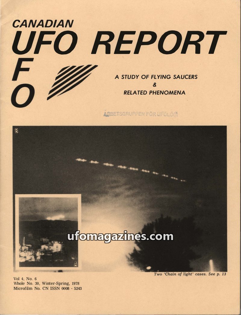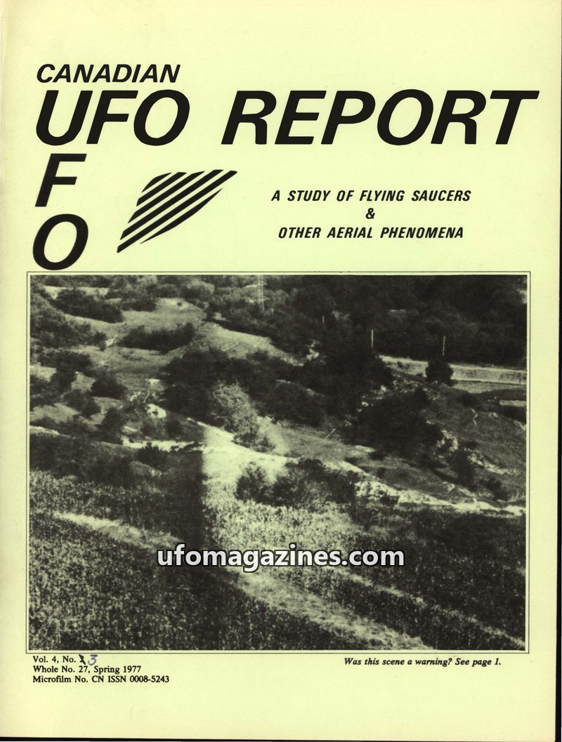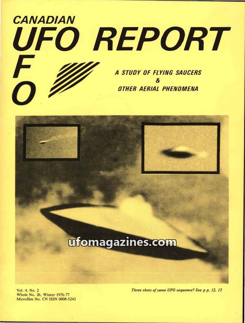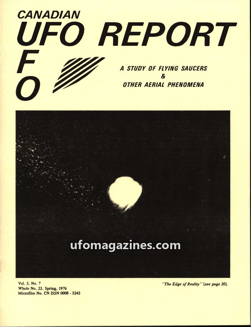 This issue of Canadian UFO Report details several intriguing UFO sightings from late 1974 to late 1976. Reports include a Canadian witness who observed an object near Radium Hot Sp