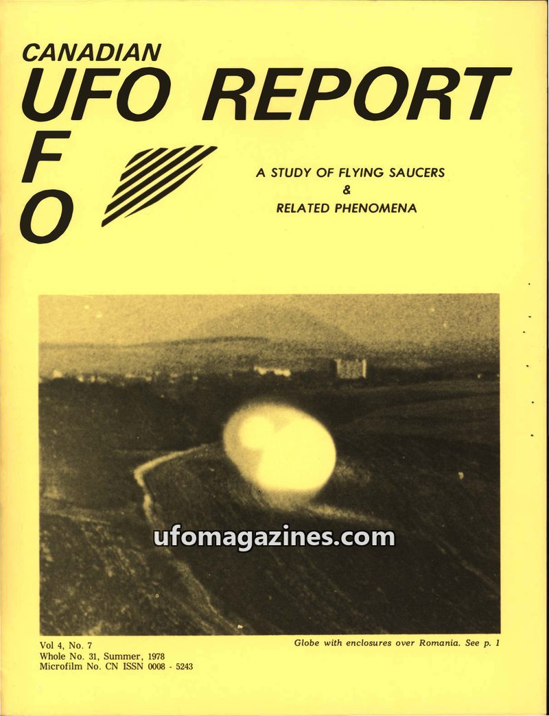 This issue of Canadian UFO Report delves into various UFO phenomena, including 'bell-jar' shaped craft and luminous globes observed in Romania and Canada. Florin Gheorghita's artic