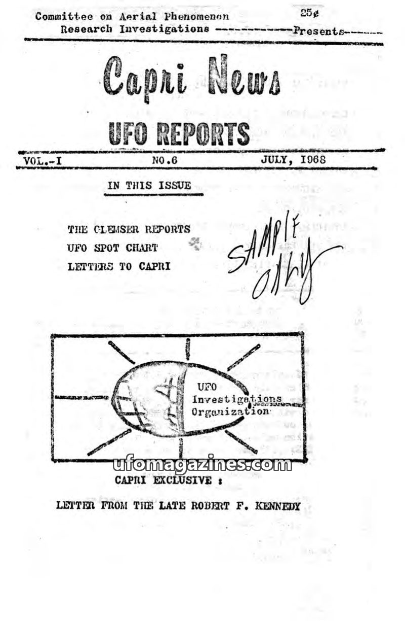 This issue of Capri News from July 1968 focuses on UFO reports and investigations. It includes an editorial criticizing the USAF and the Condon Committee for discrediting UFO pheno
