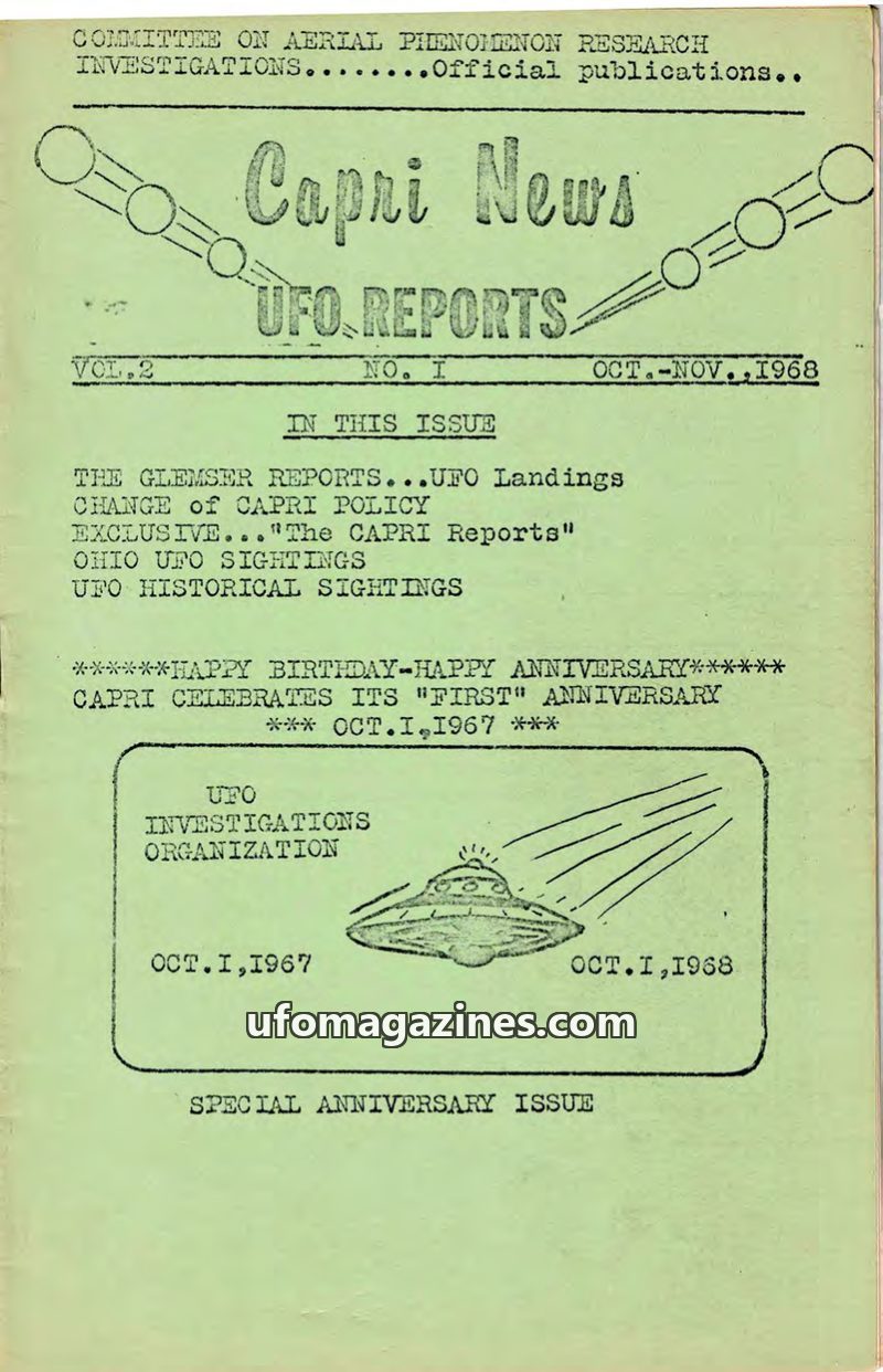 This issue of Capri News UFO Reports, dated October-November 1968, marks the first anniversary of the organization. It includes reports of UFO landings from various locations inclu