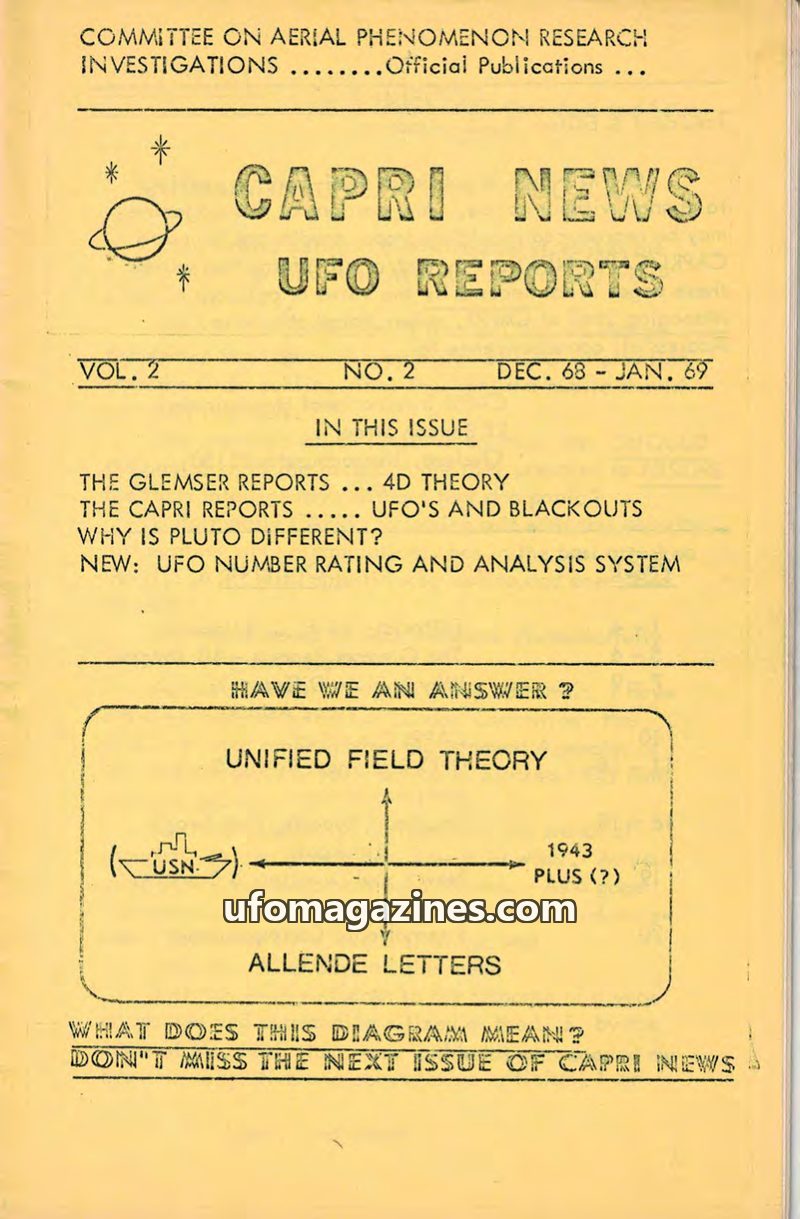 This issue of CAPRI NEWS UFO REPORTS, dated December 1968 - January 1969, features an editorial by E. J. Minasian announcing a new policy for CAPRI to cooperate with the U.S. Gover