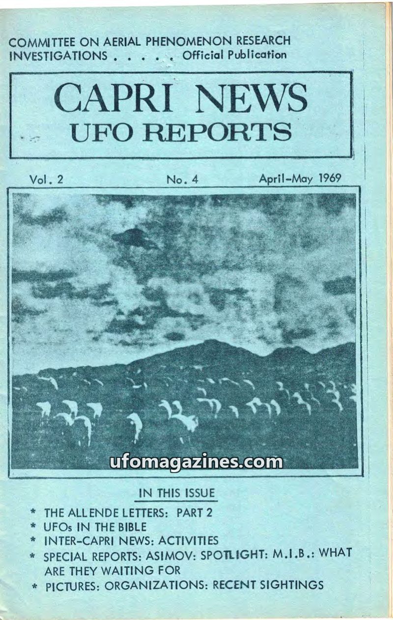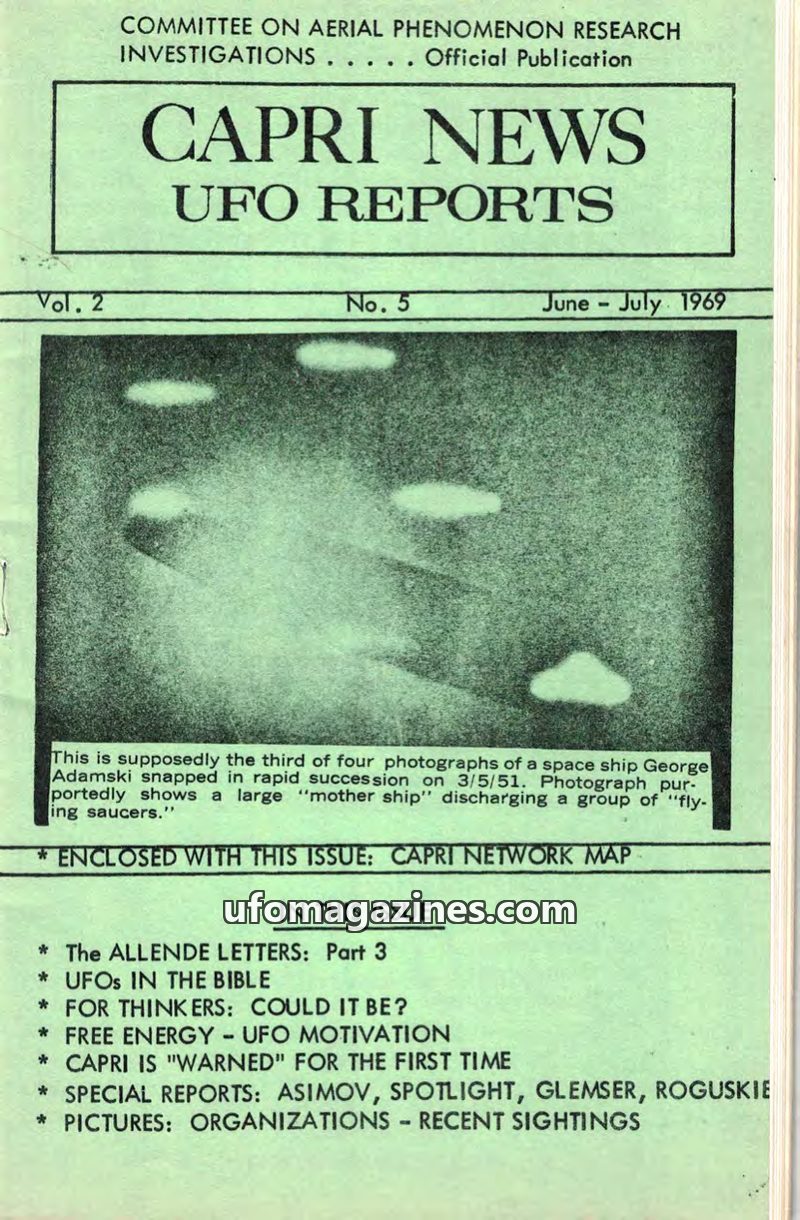 This issue of CAPRI NEWS UFO REPORTS from June-July 1969 covers a range of UFO-related topics, including an analysis of UFOs in the Bible and the potential link between free energy