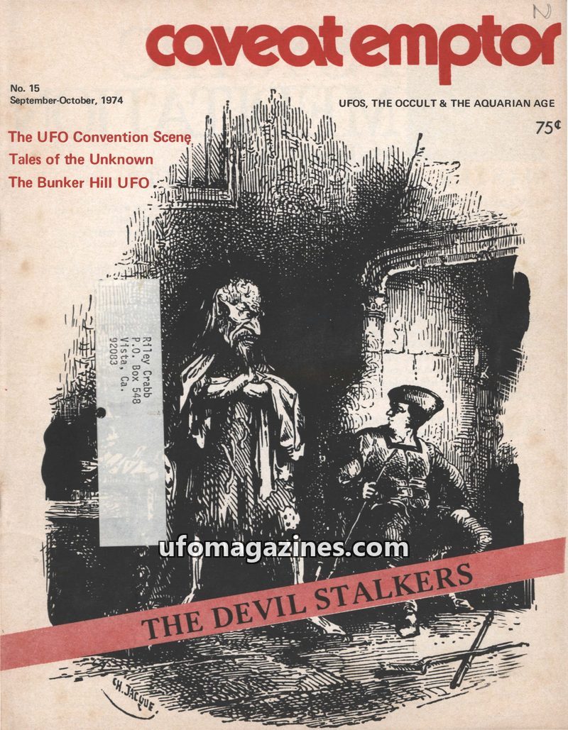This issue of Caveat Emptor, dated September-October 1974, announces its upcoming name change to Strange Worlds. It features articles on the UFO Convention Scene, the Bunker Hill U