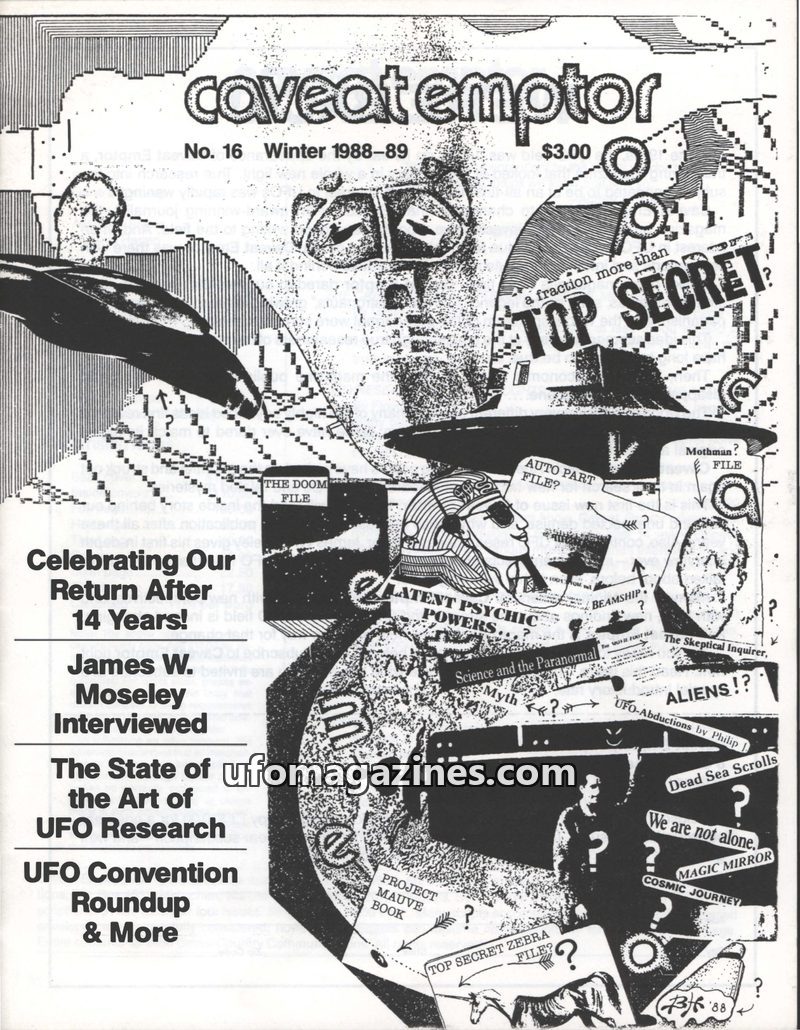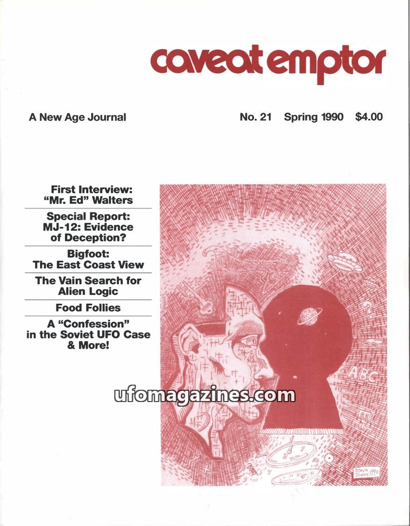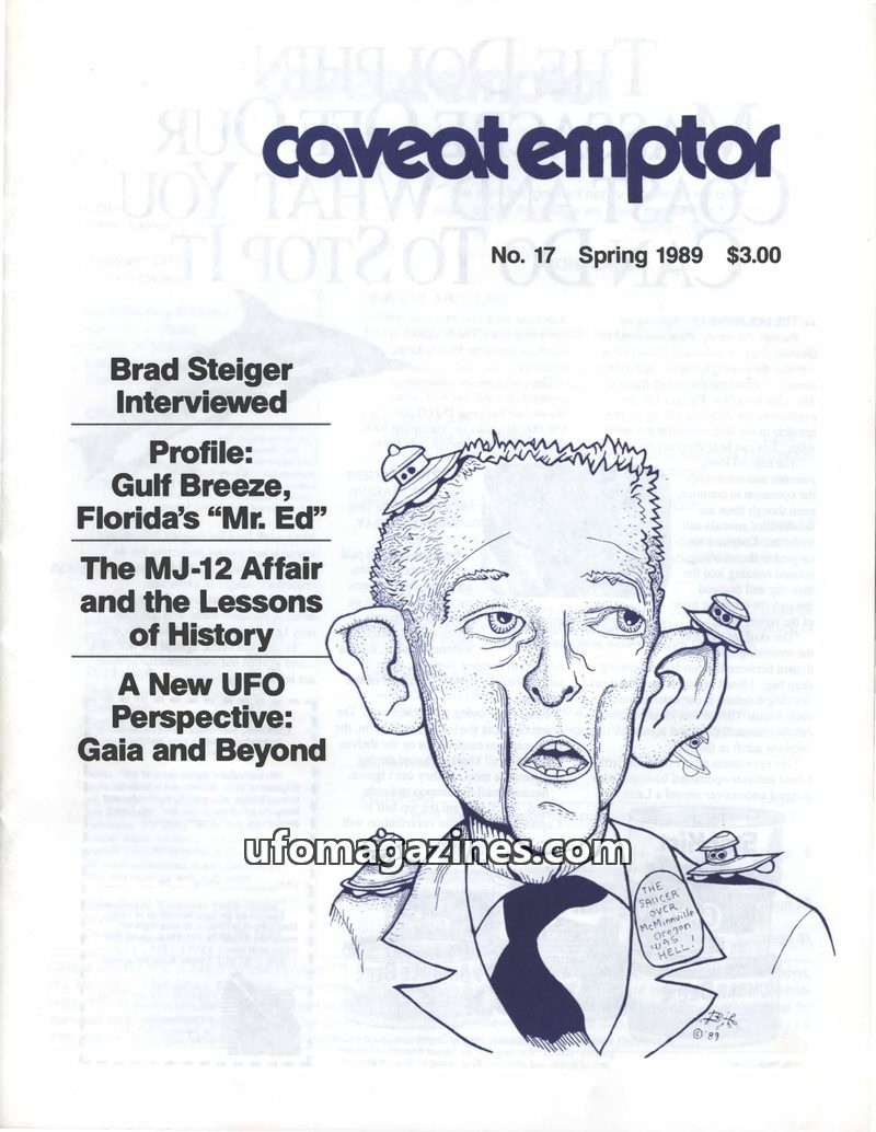 This issue of Caveat Emptor explores various UFO-related topics, including an interview with Brad Steiger, the controversial MJ-12 documents, and a new perspective on UFOs and Gaia