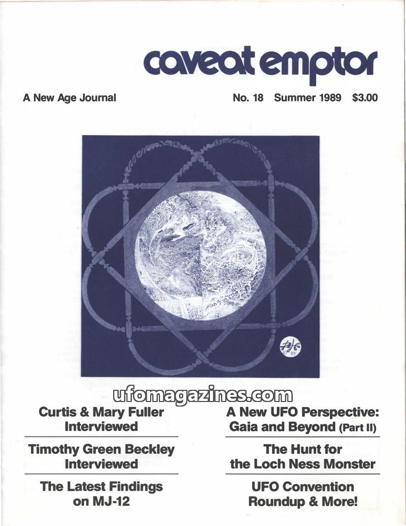 This issue of Caveat Emptor, a New Age Journal, revives the magazine after a hiatus, featuring interviews with Curtis and Mary Fuller, and Timothy Green Beckley. It delves into the