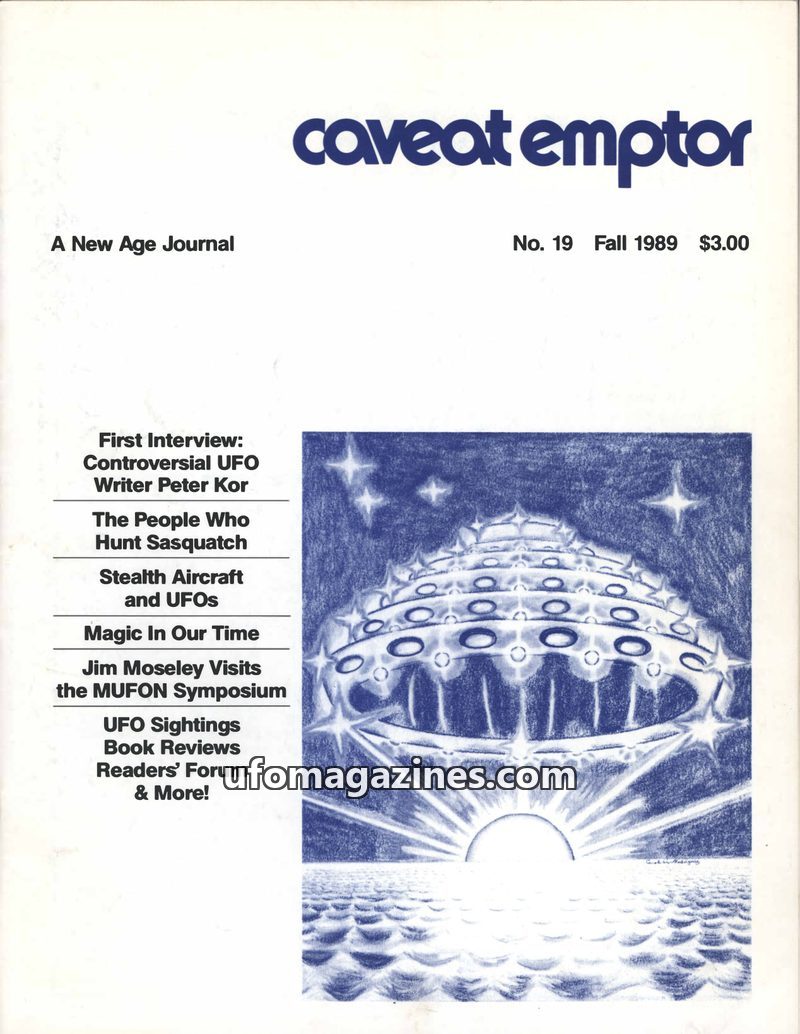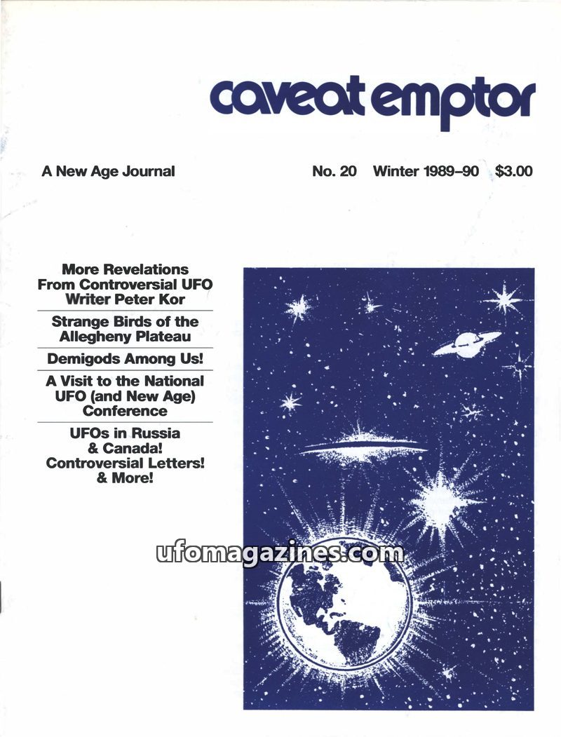 This issue of Caveat Emptor, a New Age journal, focuses on UFOs and related phenomena. It features an interview with controversial UFO writer Peter Kor, an article on people who hu