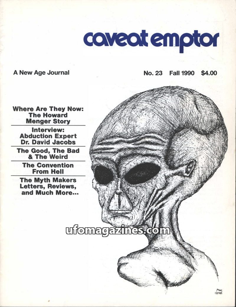 This issue of Caveat Emptor, a New Age Journal, revives the publication after a hiatus, featuring articles on the Howard Menger story, an interview with abduction expert Dr. David