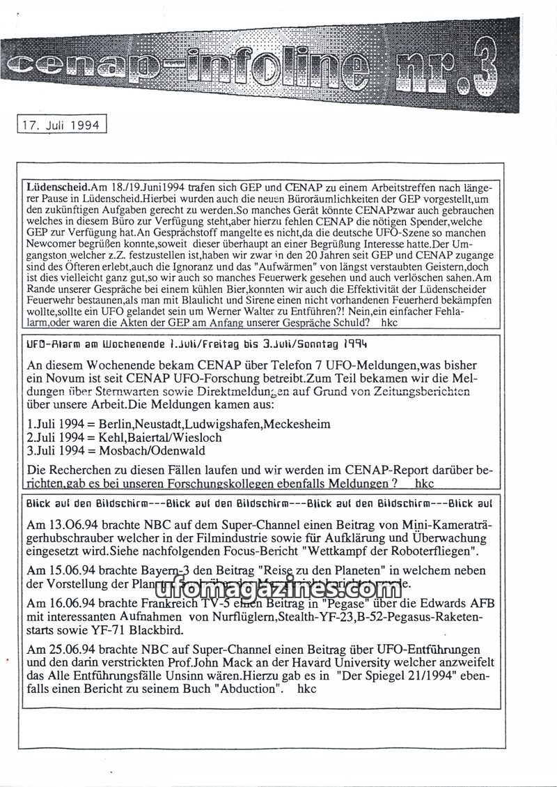 This issue of cenap-infoline from July 1994 reports on a meeting between GEP and CENAP in Lüdenscheid, and details a busy UFO reporting weekend for CENAP with multiple sightings ac