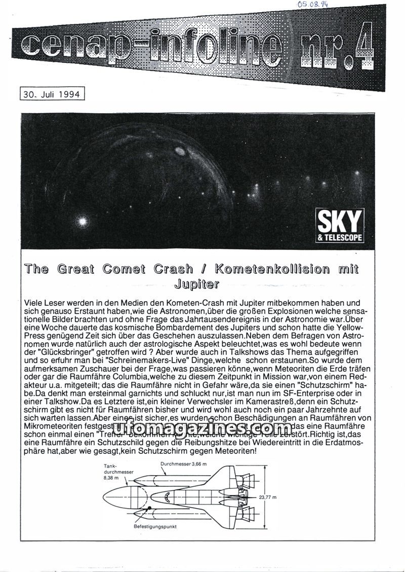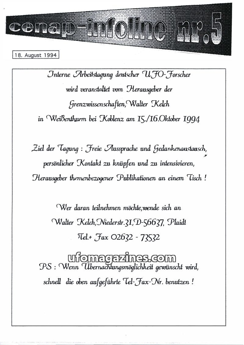 This issue of cenap-infoline (August 1994) announces an internal conference for German UFO researchers hosted by Walter Kelch in Weißenthurm. It reports on several daylight meteor