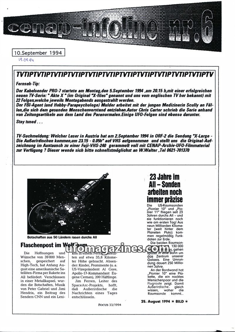 This issue of cenap-infoline from September 1994 covers various topics including the premiere of the TV series 'Akte X' (X-Files), a 'message in a bottle' sent into space with huma