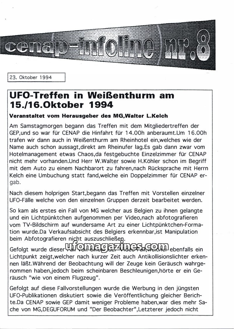 The cenap-infoline issue No. 8 details a UFO meeting held in Weißenthurm on October 15-16, 1994, organized by Walter L. Kelch. The meeting involved discussions and presentations of