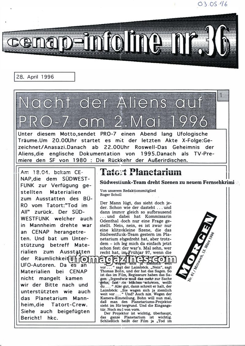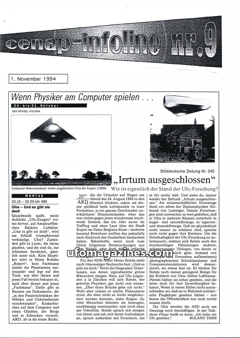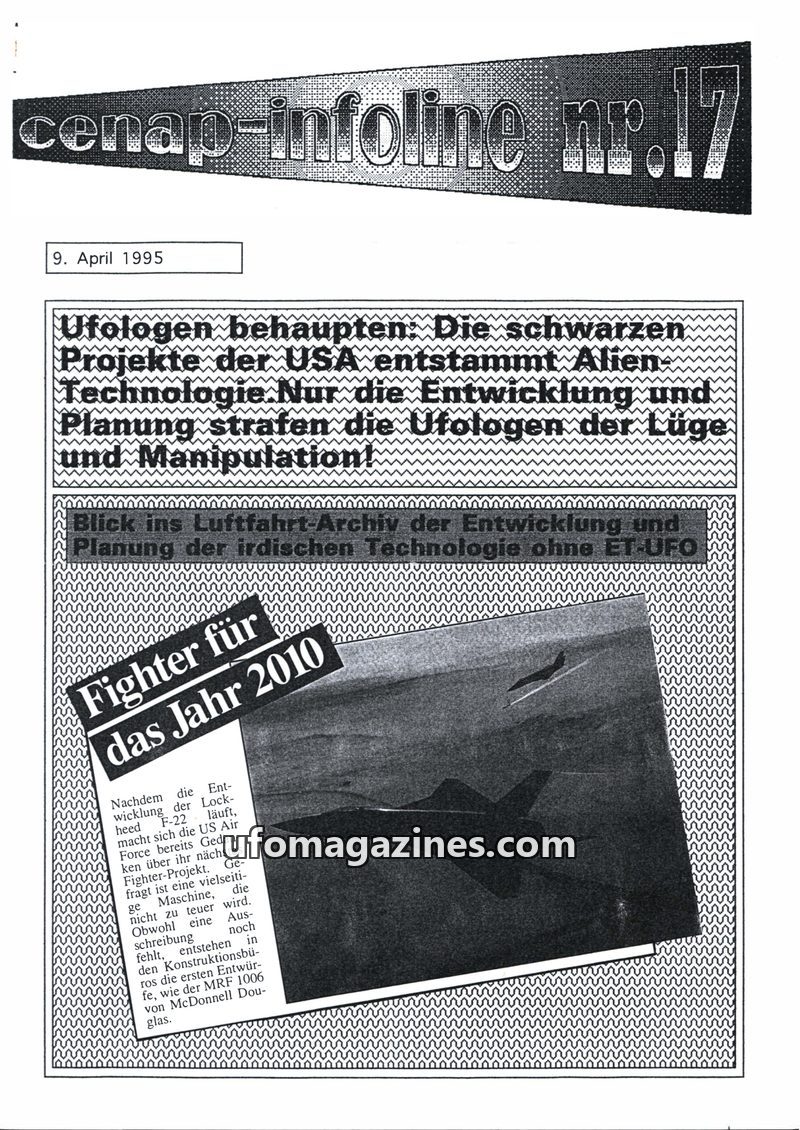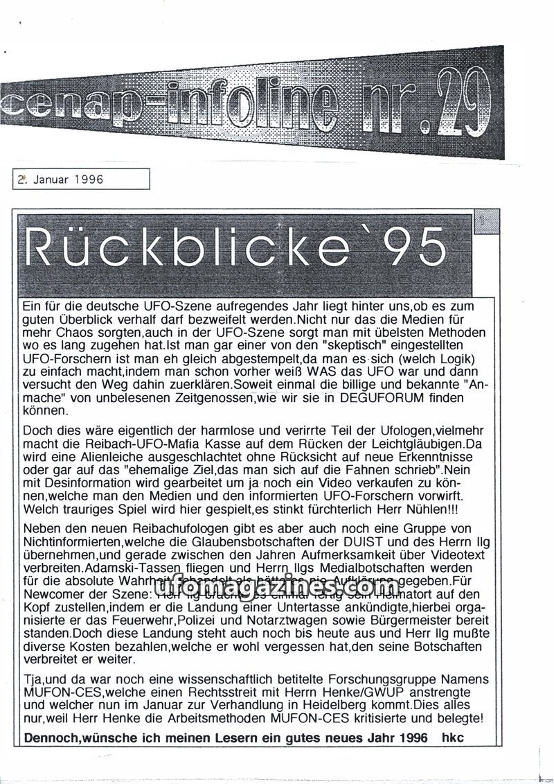 This issue reviews the German UFO scene in 1995, criticizing misinformation and commercialization tactics within the community. It highlights specific cases, including alleged sigh