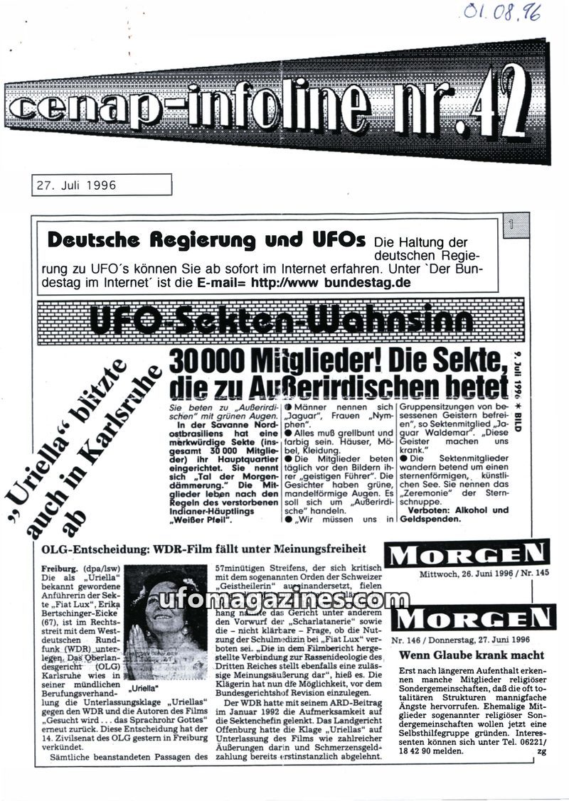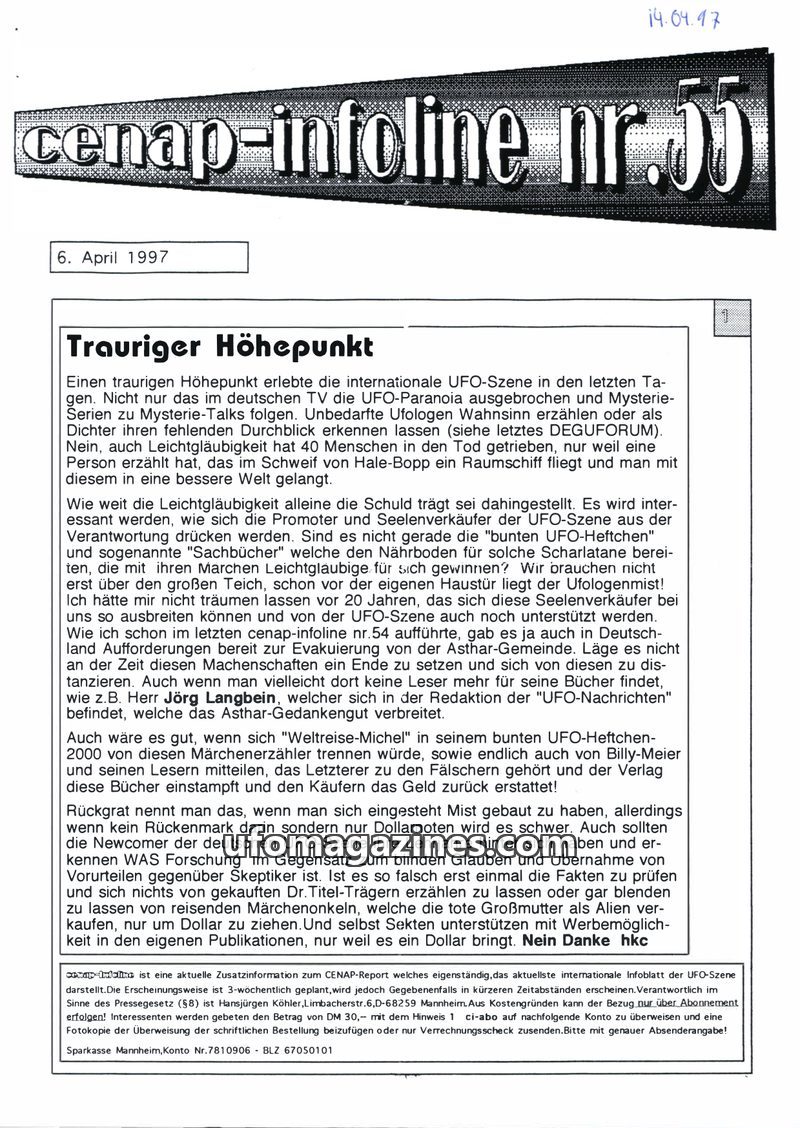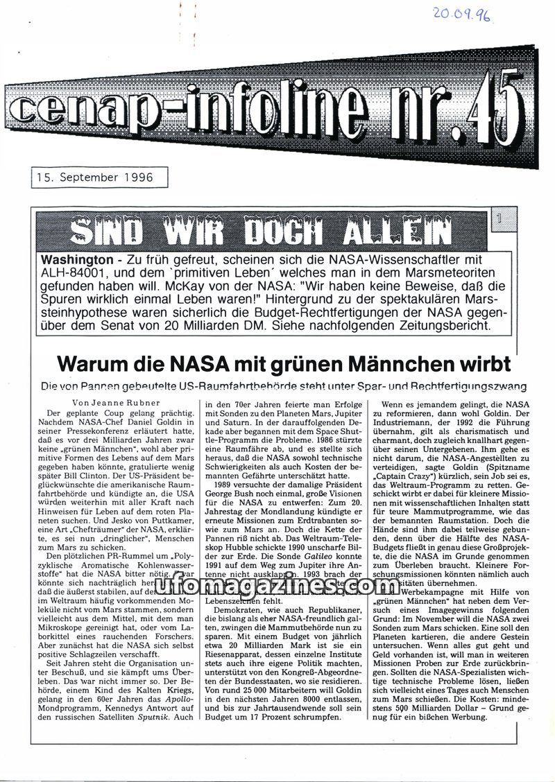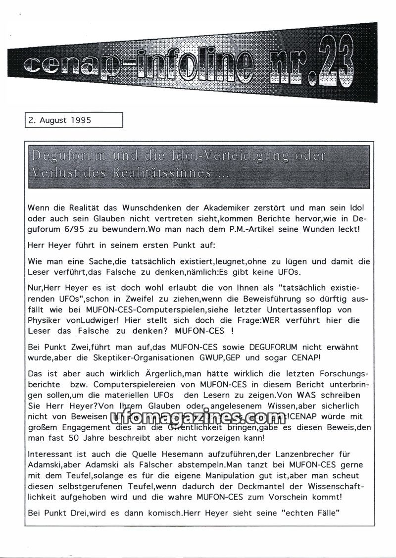 This issue reviews the German UFO scene in 1995, criticizing misinformation and commercialization tactics within the community. It highlights specific cases, including alleged sigh