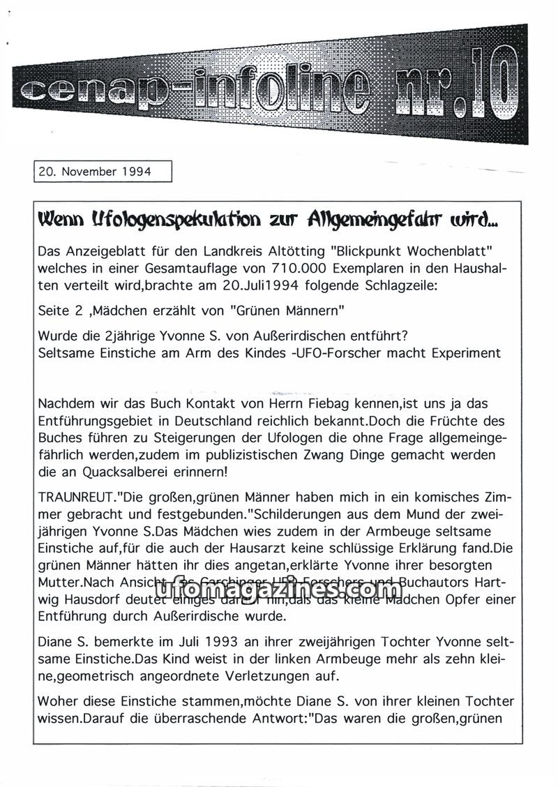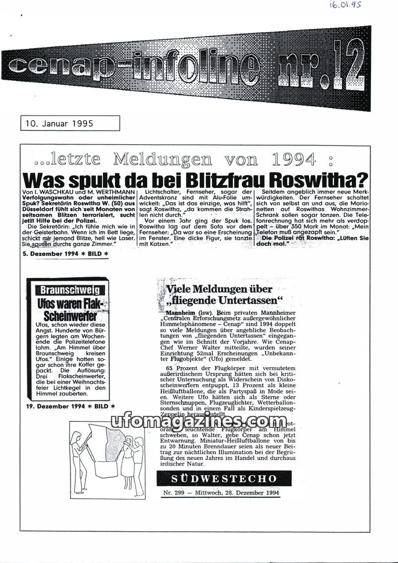This issue of cenap-infoline covers several unusual reports from 1994 and early 1995. It details the case of Roswitha W. from Düsseldorf, who claims to be targeted by mysterious fl