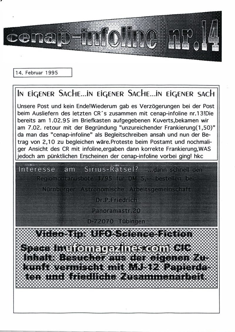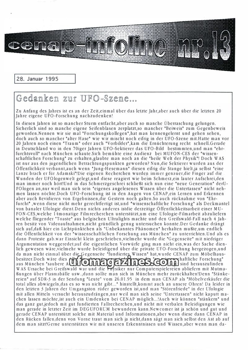 This issue of cenap-infoline, dated January 28, 1995, reflects on the state of UFO research in Germany, criticizing organizations like MUFON-CES for perceived lack of scientific ri