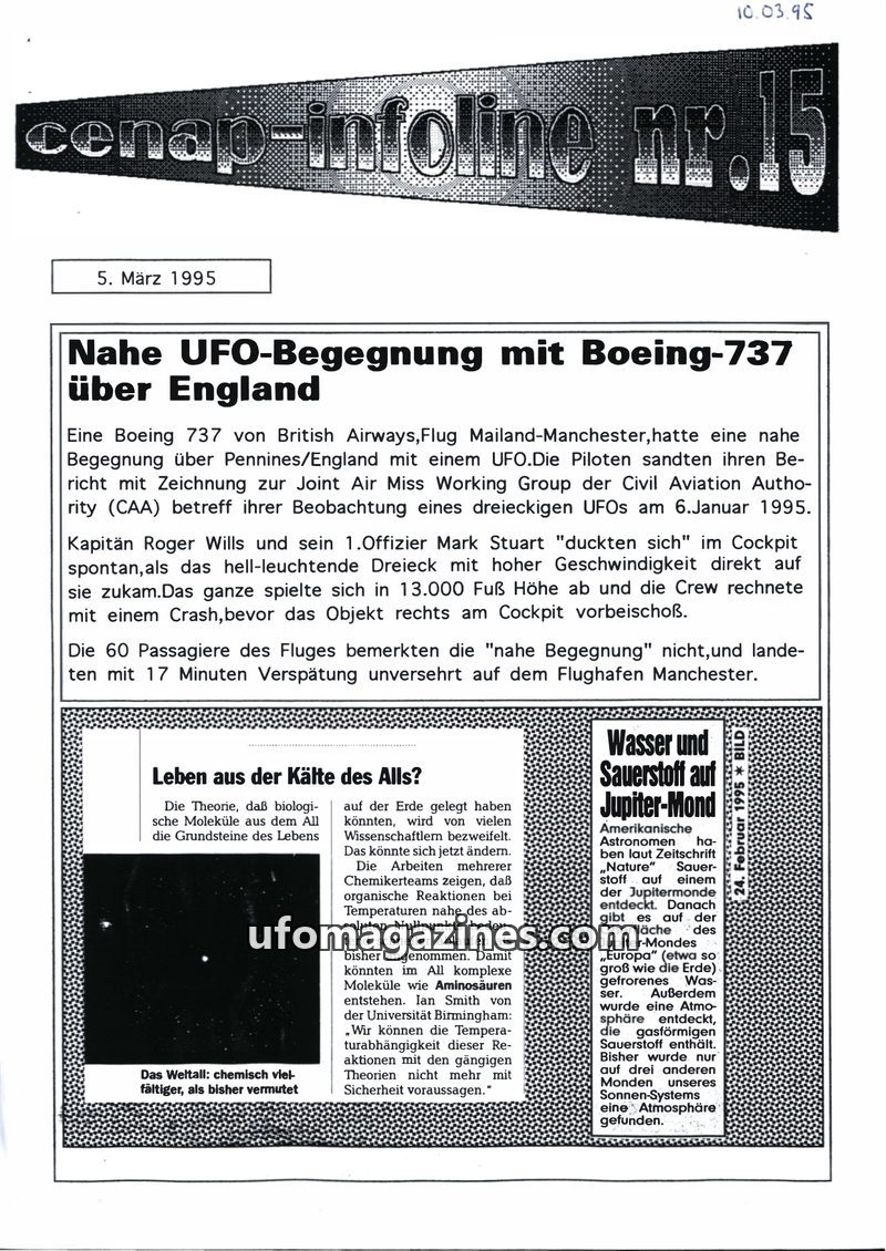 This issue of cenap-infoline features a report on a close UFO encounter experienced by the crew of a British Airways Boeing 737 over England on January 6, 1995. The magazine also c