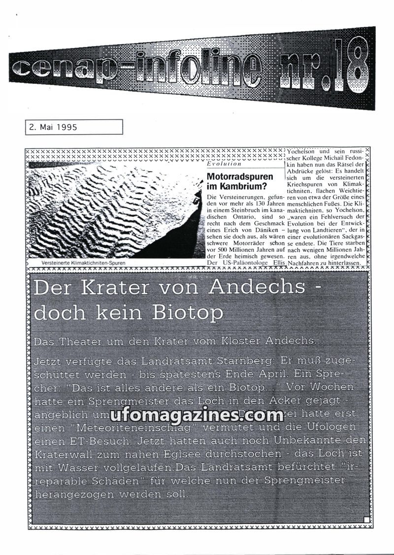 This issue of cenap-intoline focuses on a supposed meteorite impact in Andechs, Germany, which was later revealed to be a controlled explosion for creating a biotope. The magazine